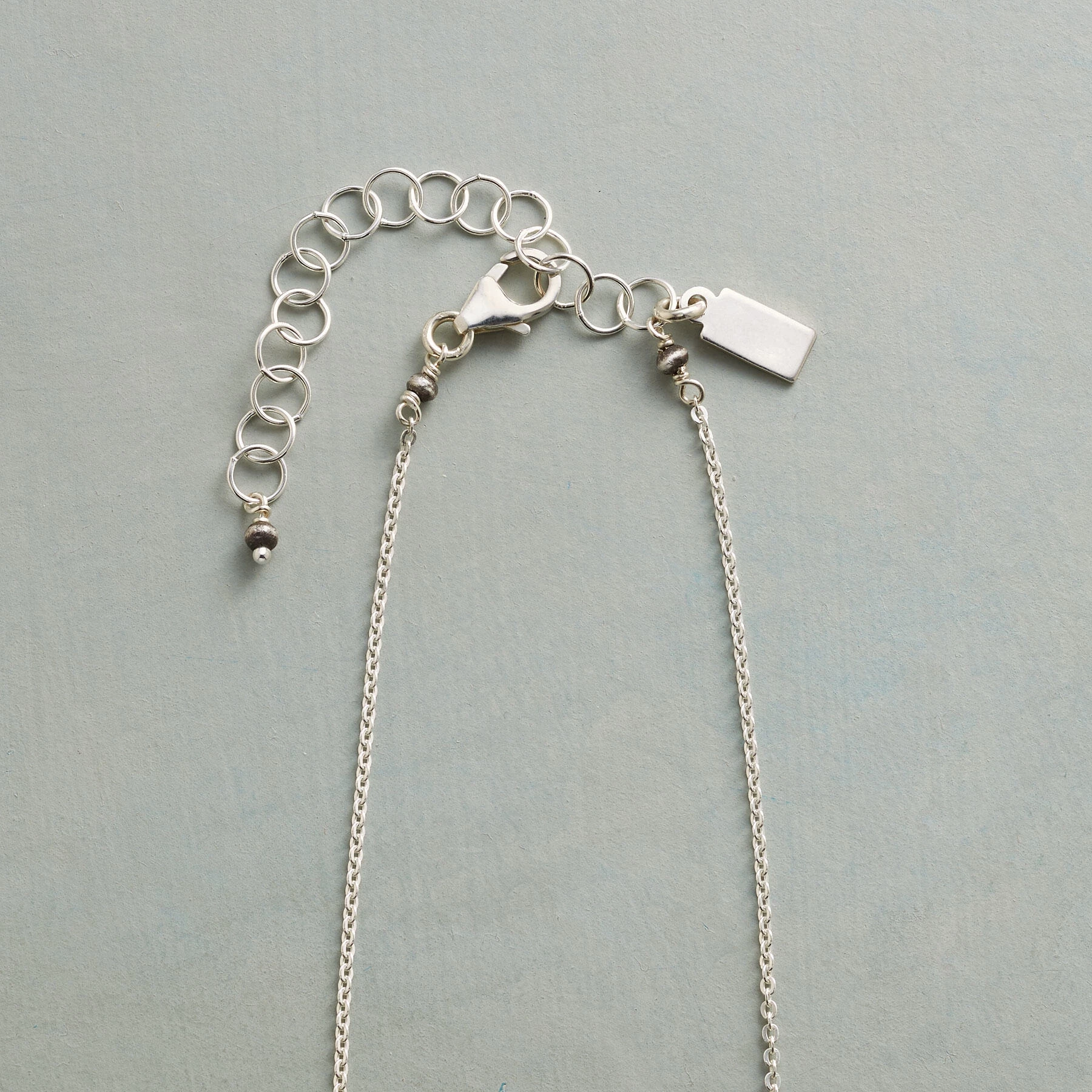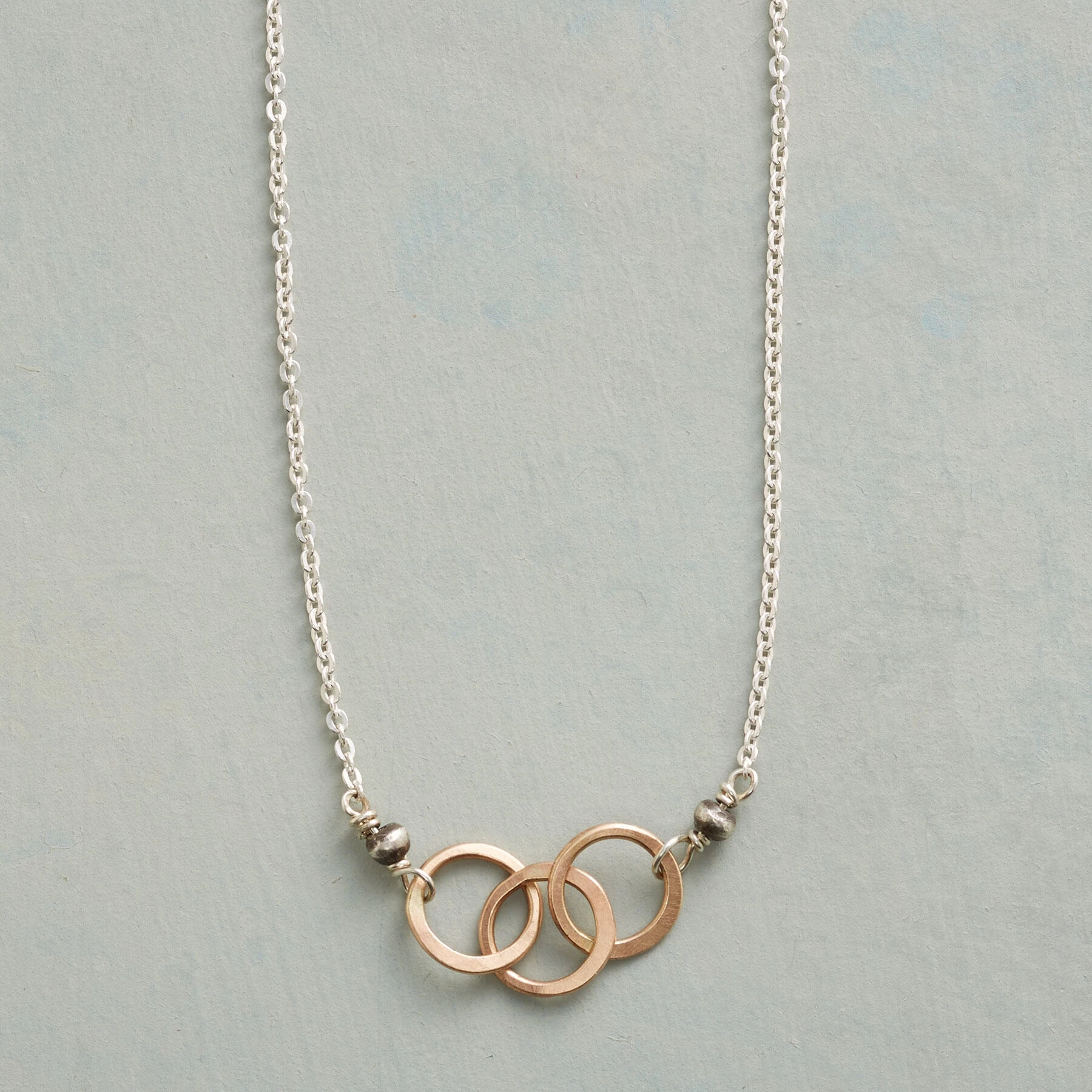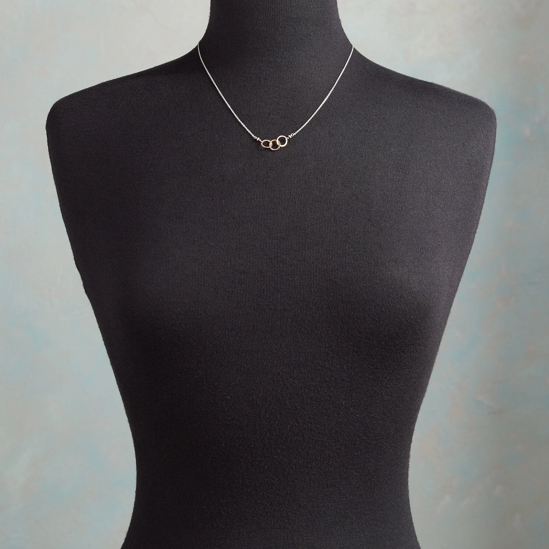 Interconnected 14kt gold filled rings are joined by oxidized beads to a strand of shiny sterling silver links. Lobster clasp. Handcrafted in USA. Exclusive. Adjusts 17″ to 19″L.