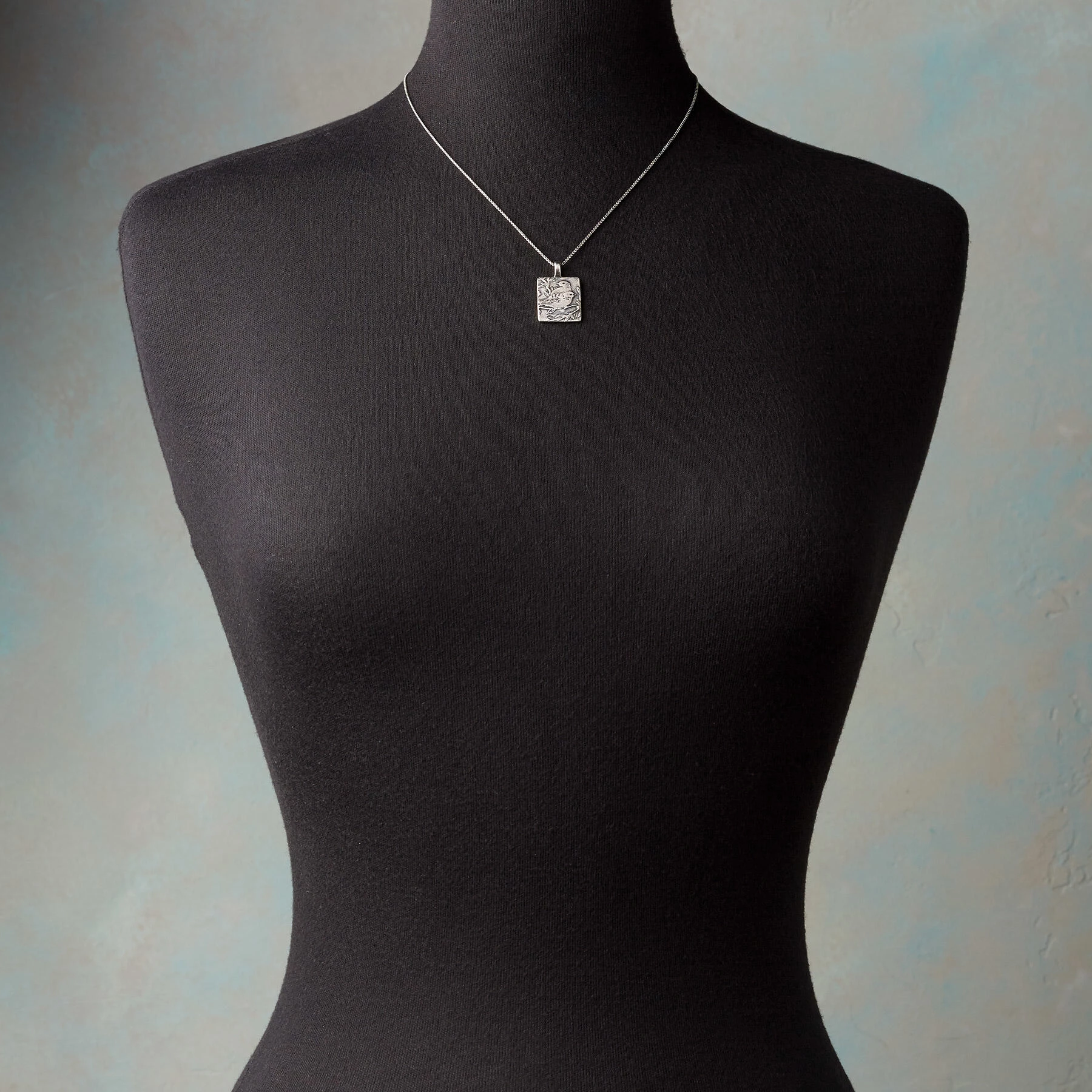 A sweet reminder of love that lasts for life, this dainty sterling box chain necklace holds a sterling silver charm on which two lovebirds perch amidst forest trees. Sterling ring clasp. 18″L.