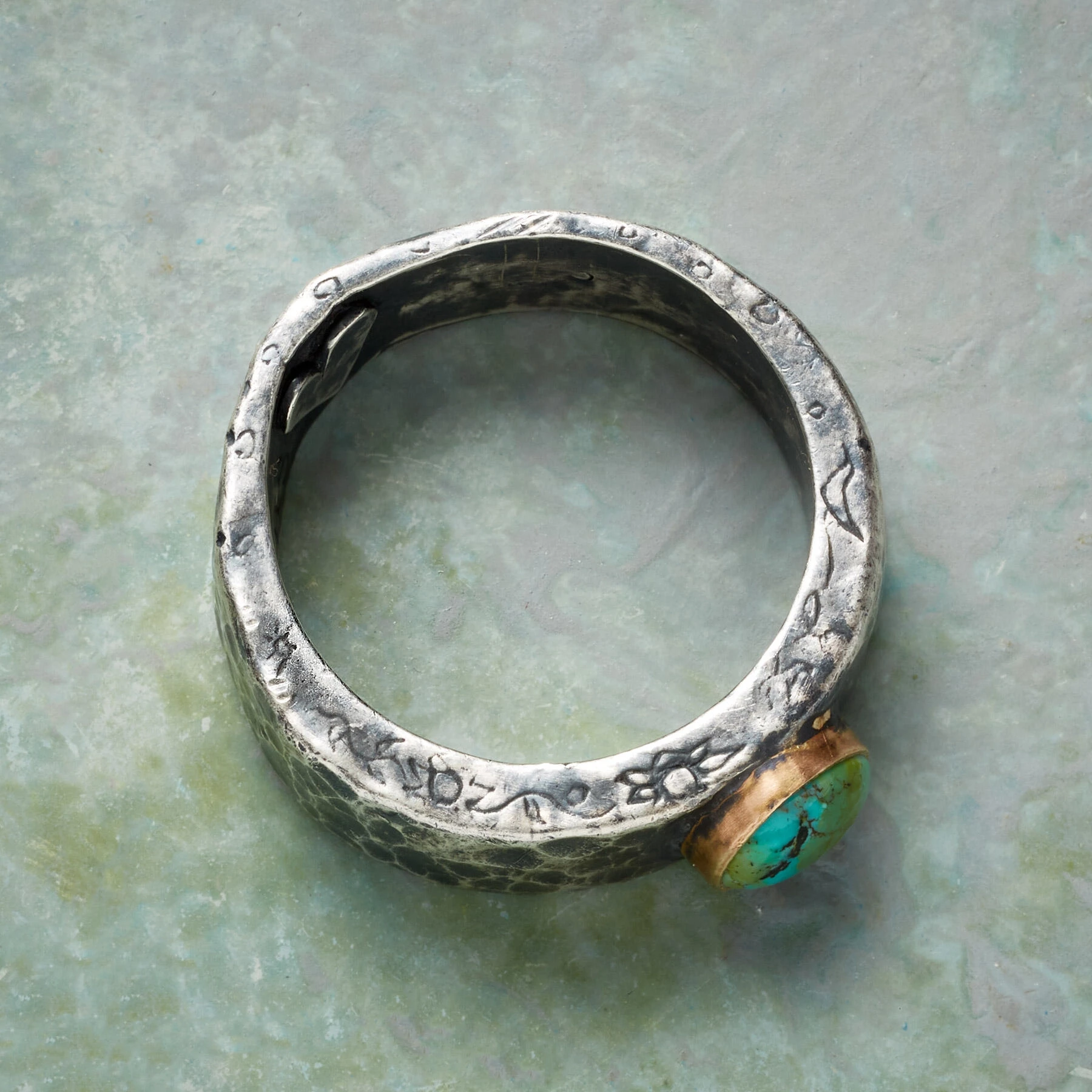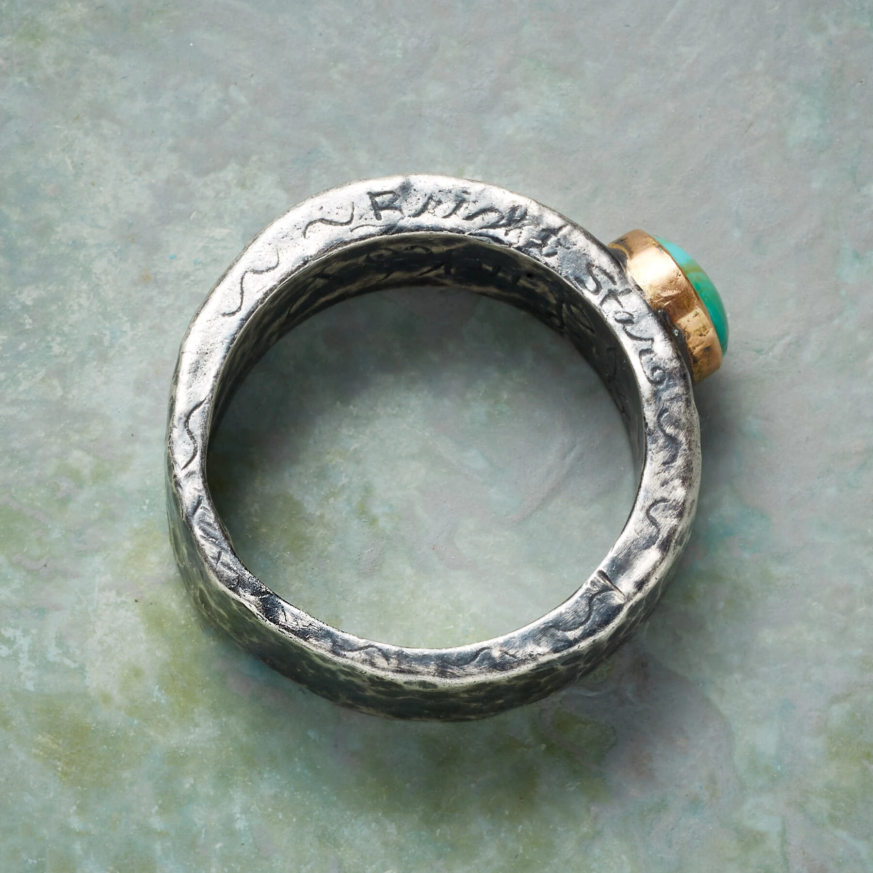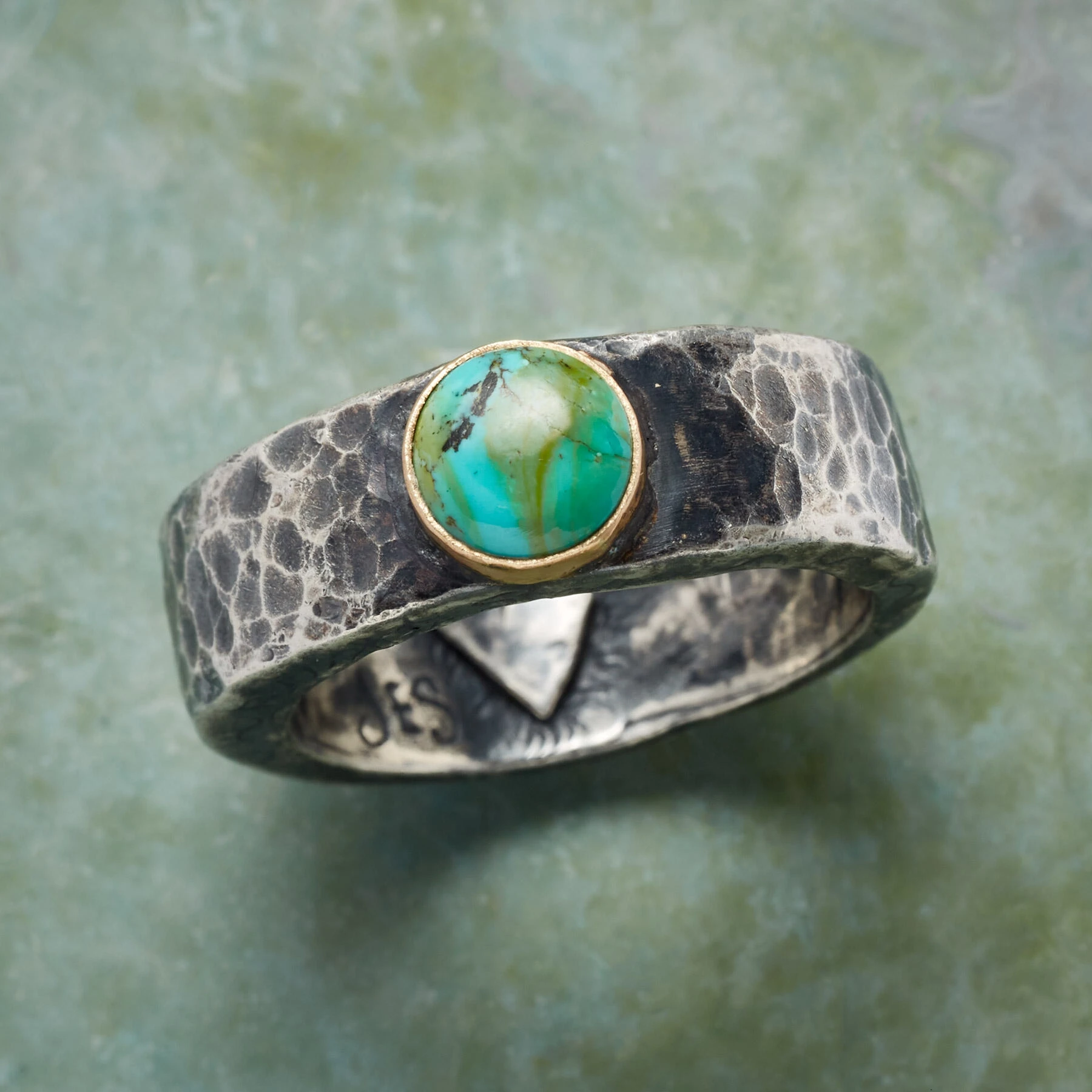 Jes MaHarry sets her substantial, hammered sterling silver band with a turquoise cabochon edged in 14kt gold and inscribes the word “Lucky” inside as a reminder of life’s good fortune. Handmade in USA. Exclusive. Whole sizes 9 to 13.