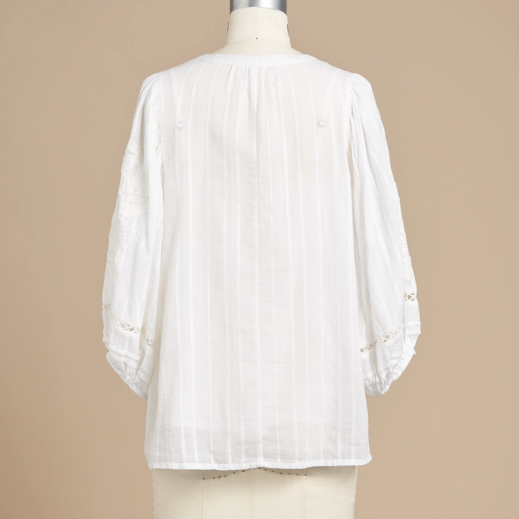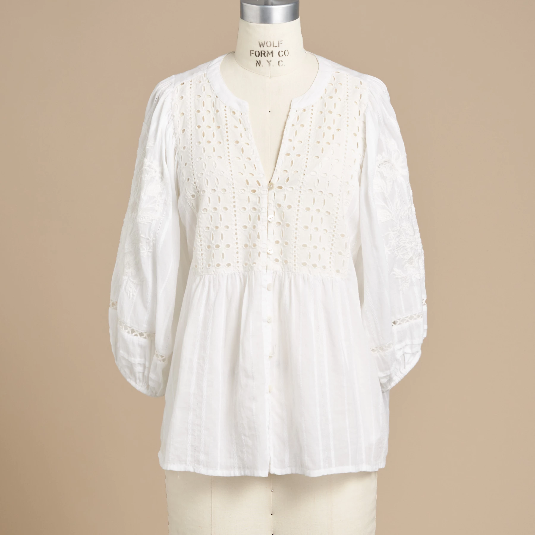 You’ll adore the detail in this beautiful, tonal-striped, cotton dobby top. With pintucks, ladder lace, an eyelet bib, tonal embroidery on sleeves and shell button henley placket. Elbow-length elastic sleeves. Hand wash. Imported. Exclusive. Sizes XXS (00), XS (0 to 2), S (4 to 6), M (8 to 10), L (12 to 14), XL (16 to 18). Approx. 23″L.