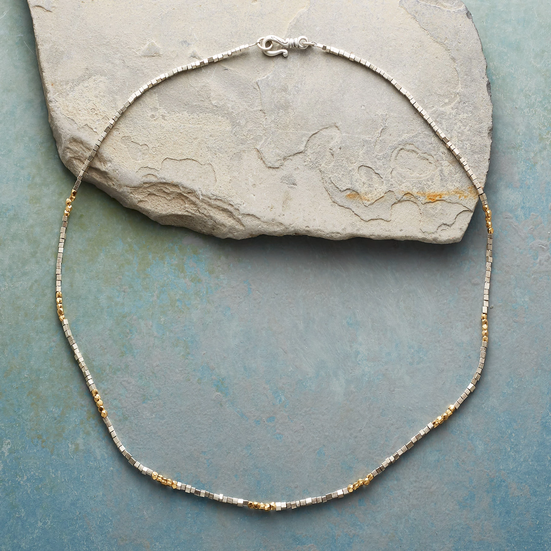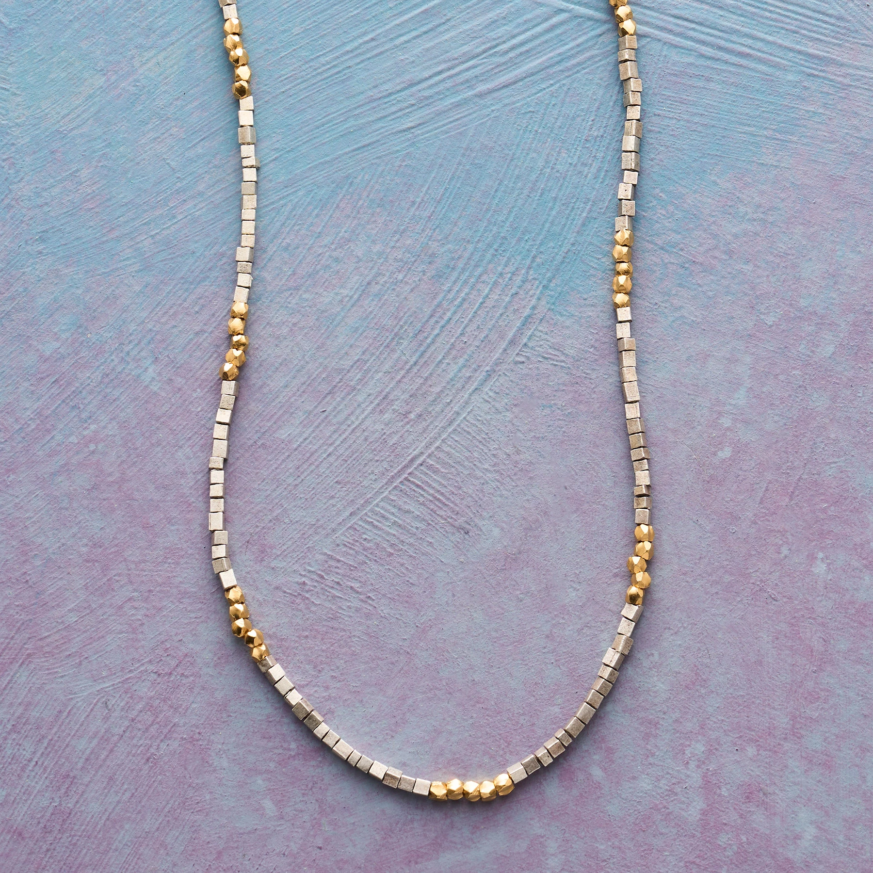 A meeting of precious metals to harmonize with all your other jewels. Handmade of sterling silver and 18kt gold plate. Sterling silver hook clasp. Exclusive. Made in USA. 19″L.