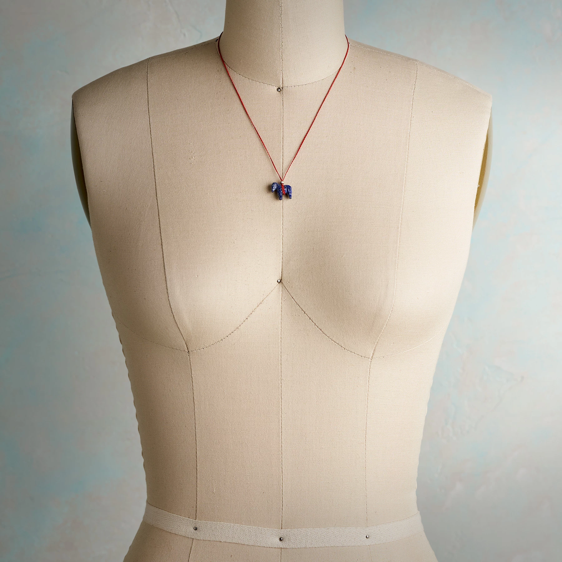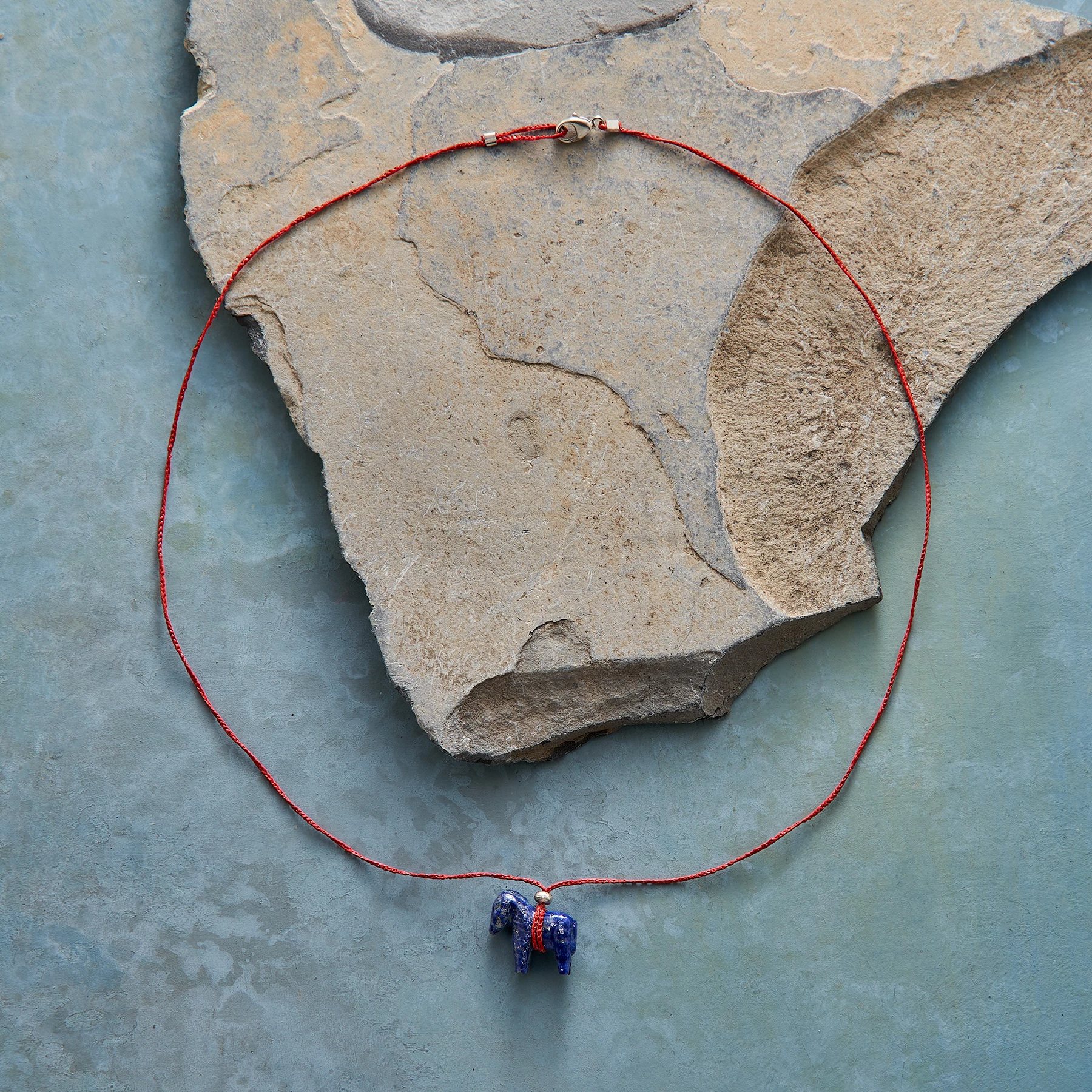 Jes MaHarry names her carved lapis figurine after her own horse, Mondo, the stout charm suspended from woven red nylon with a sterling silver bead. Exclusive. Handmade in USA. Lobster clasp. Approx. 18″L.