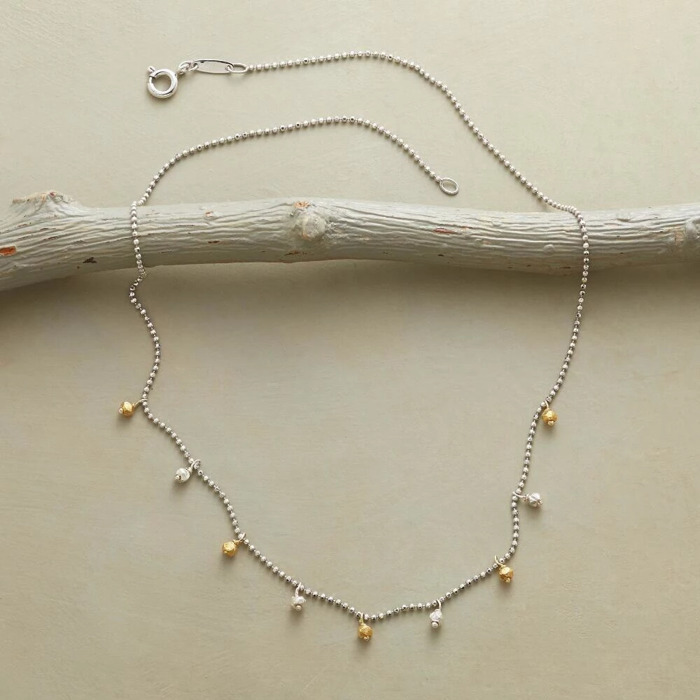 A silver and gold bead necklace, in which faceted Thai beads in sterling silver and 24kt goldplate are spaced along a rhodium-plated, diamond-cut chain. USA. Exclusive. 16″L.