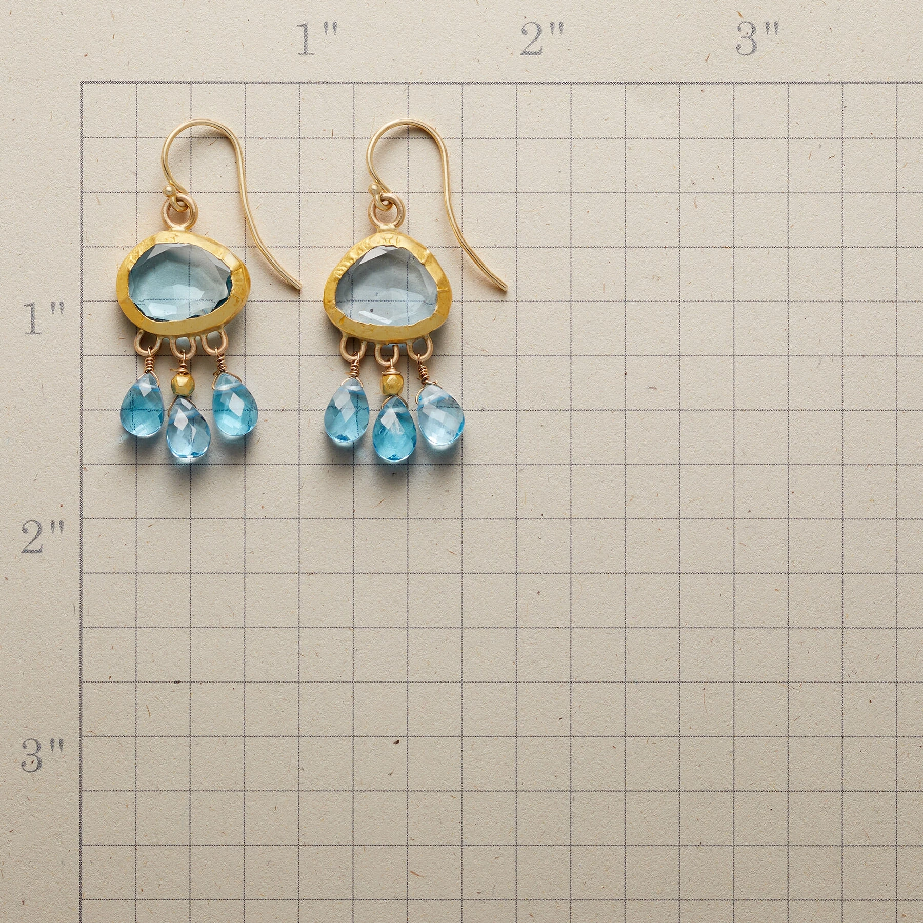 Nava Zahavi’s Handmade earrings are set with blue topaz, each stone unique and framed in 24kt yellow gold. Below, drops of faceted blue topaz dance amidst the gleam of an 18kt yellow bead. 14kt gold French wires. Exclusive. 1-1/2″L.