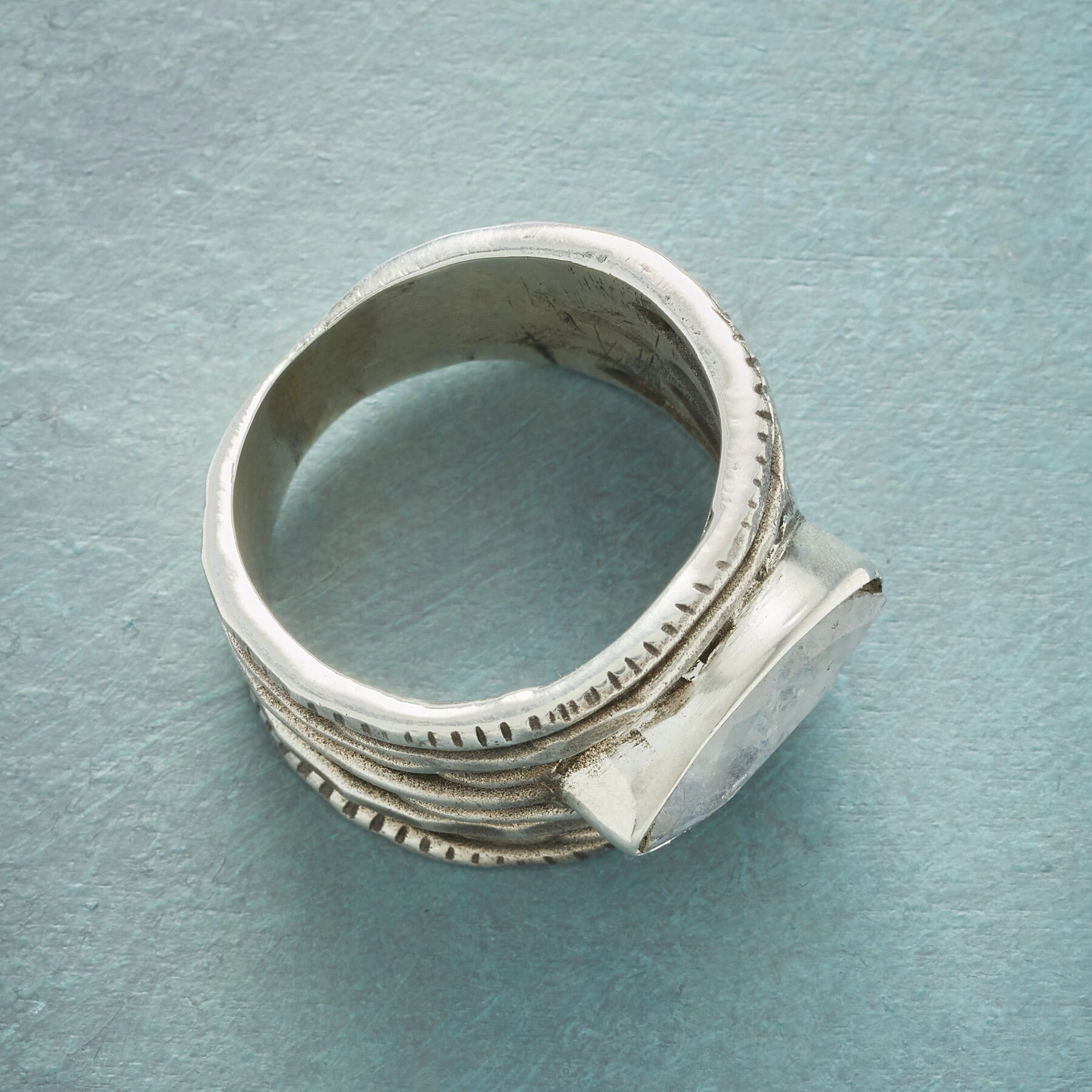 A moonstone casts rainbow hues upon streams of sterling silver. The handcrafted ring widens as it rounds the finger. 5/8″ tapers to 3/8″W. Whole sizes 6 to 10.