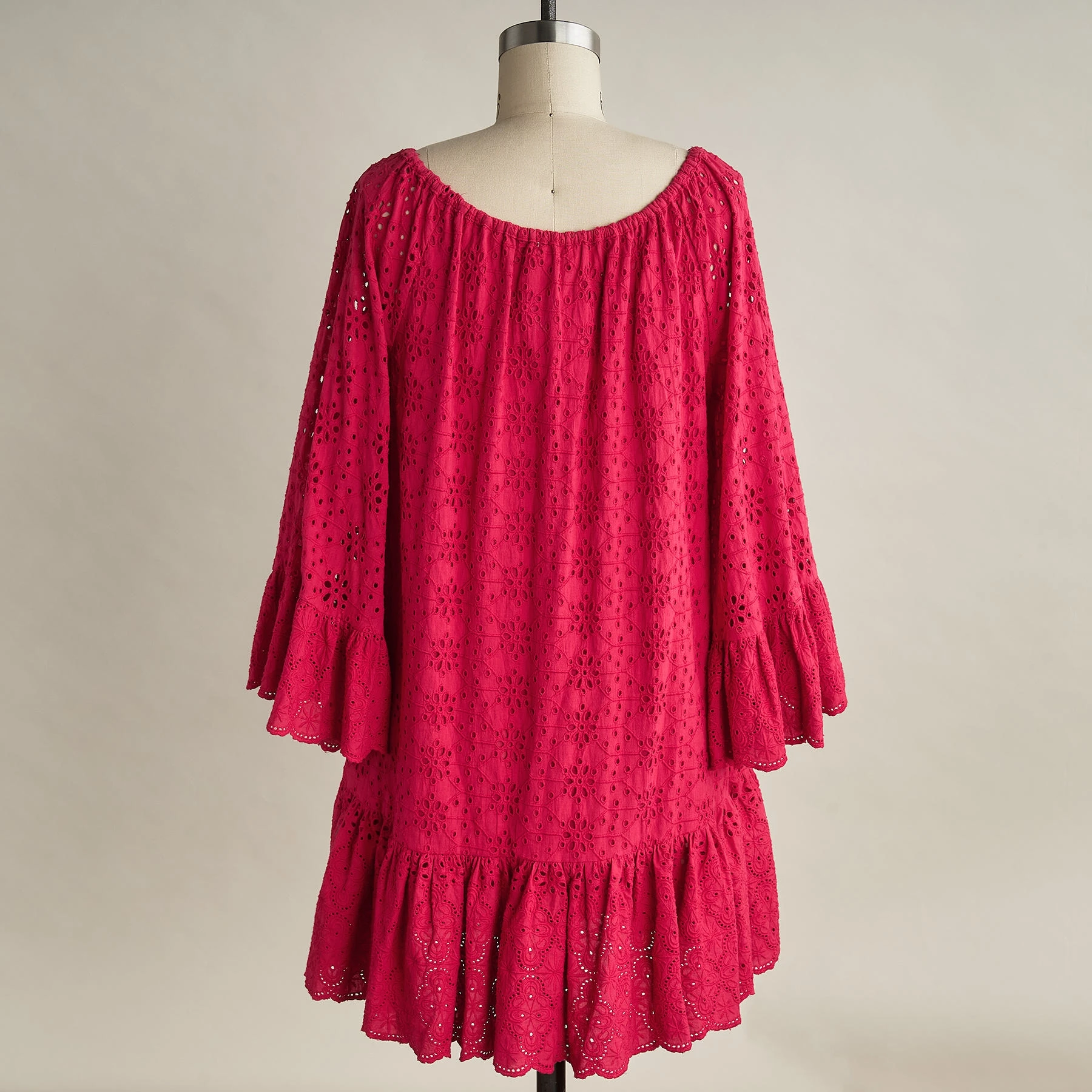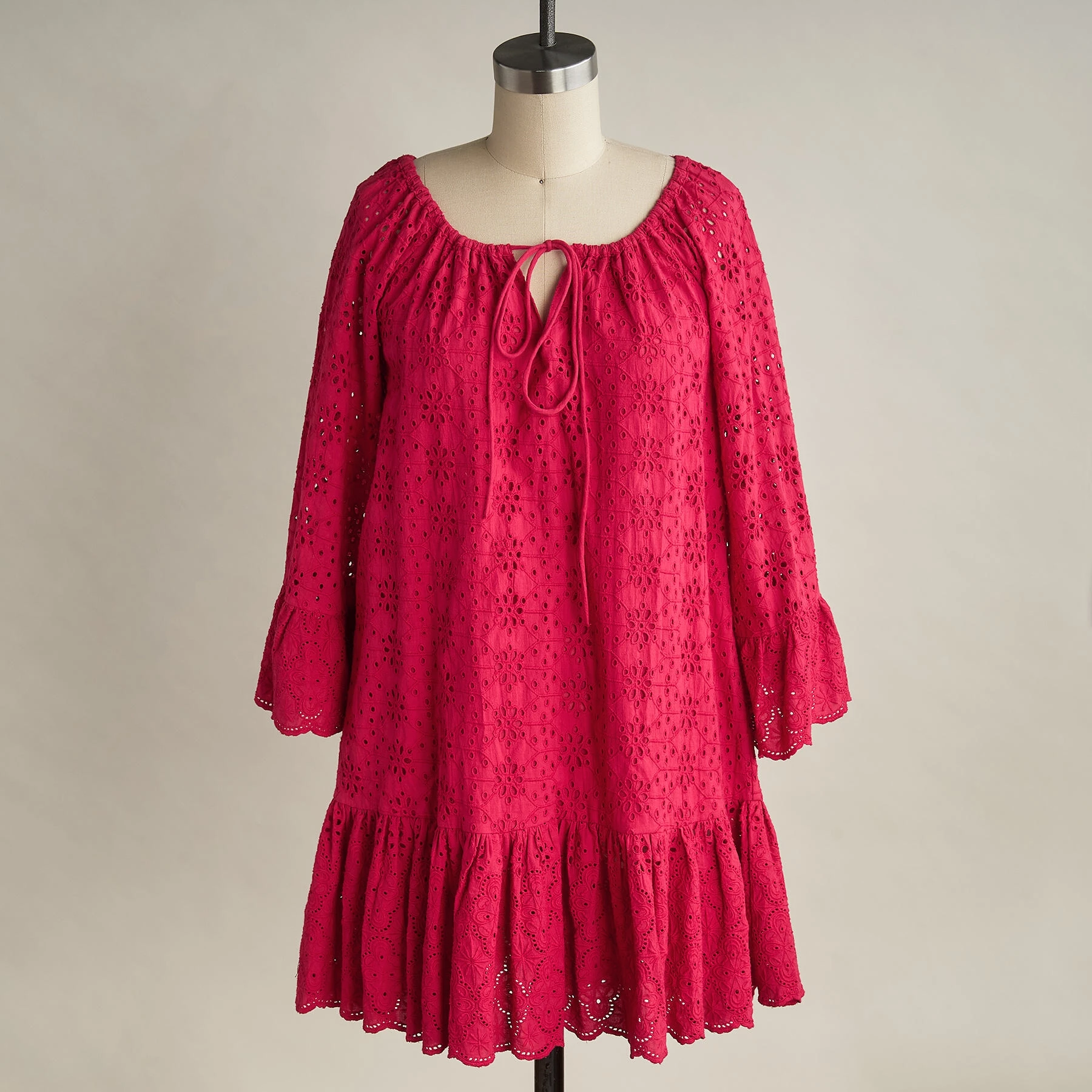 Perfect for easy waterfront style, this elegant, eyelet cover-up has all the best details: ruffled cuffs, raglan sleeves, elastic neckline with ties, and scalloped hem. Cotton. Machine wash. Imported. Exclusive. Sizes XS (0 to 2), S (4 to 6), M (8 to 10), L (12 to 14), XL (16 to 18), XXL (20 to 22). Approx. 33″L.