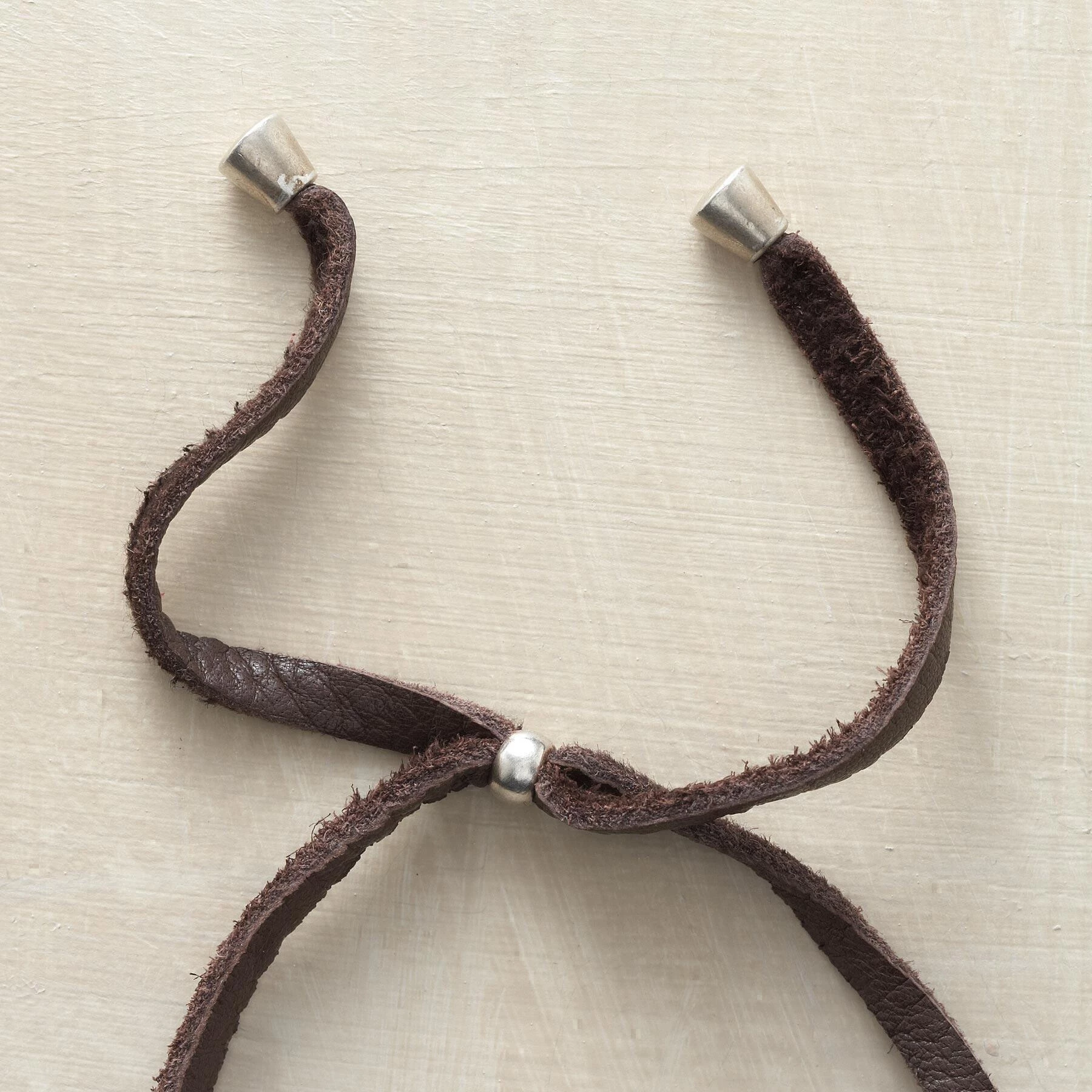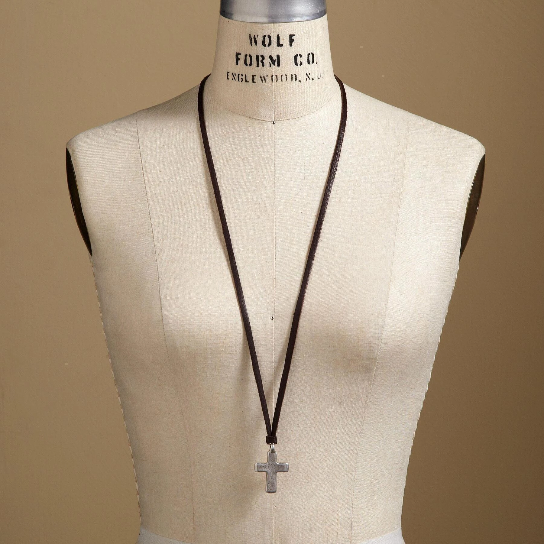 A handmade, organically-shaped brushed sterling silver cross of Ethiopian origins is suspended from a sueded strand of deerskin with silver end caps. Exclusive. Handmade in USA of imported materials. A sterling silver slider bead adjusts the length to 32″l.