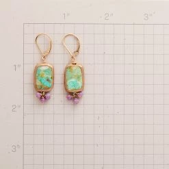 Each tinted stabilized green turquoise wrapped in antiqued copper tells its own dramatic story. Phosphosiderite trios dangle below. Exclusive. Handcrafted in USA. 14kt gold-filled lever back wires. 1-3/4″L.