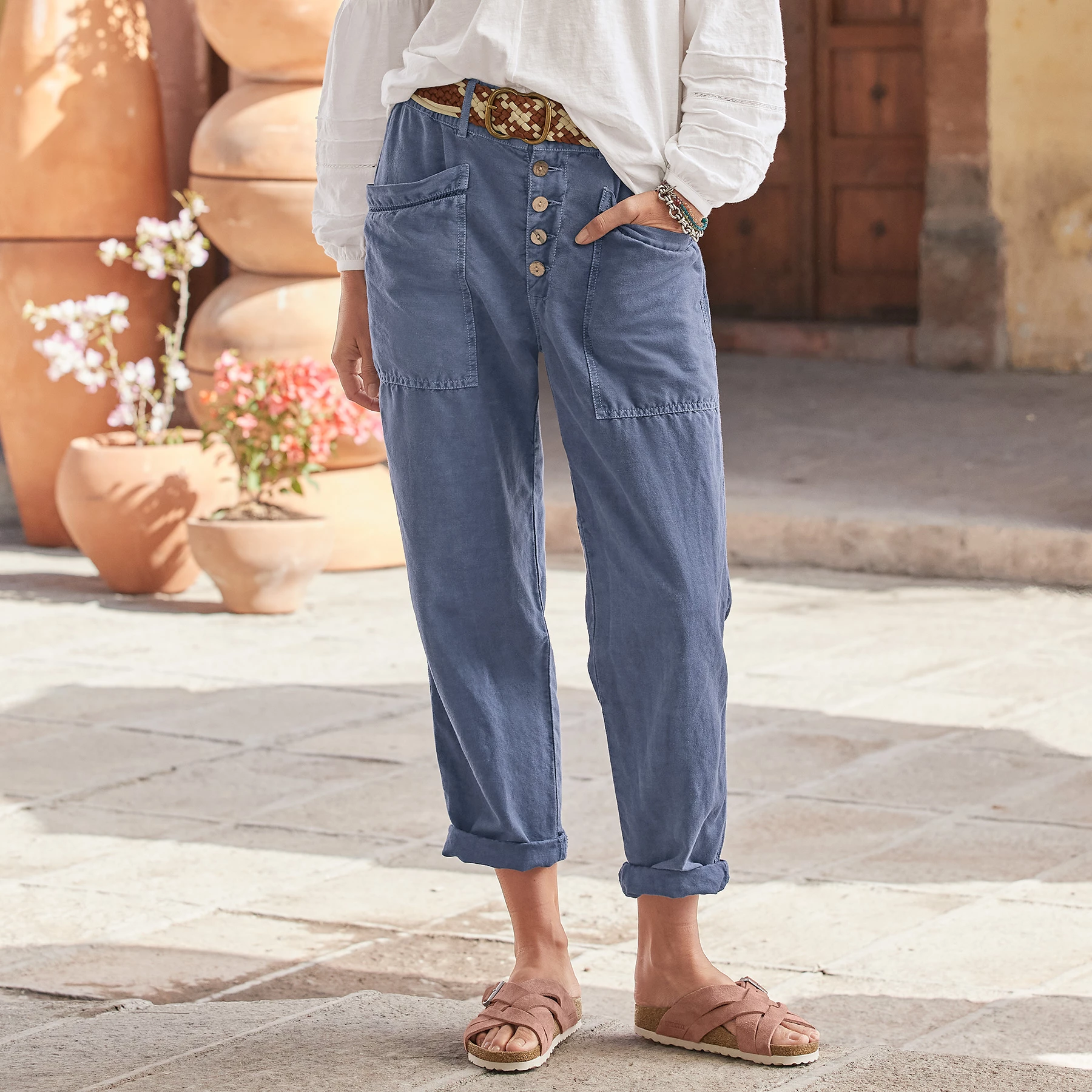 Easy, button fly pants with elastic back. Ladder lace detail. Linen/cotton. Machine wash. Imported. Exclusive. Sizes 2 to 16. 28″ inseam.