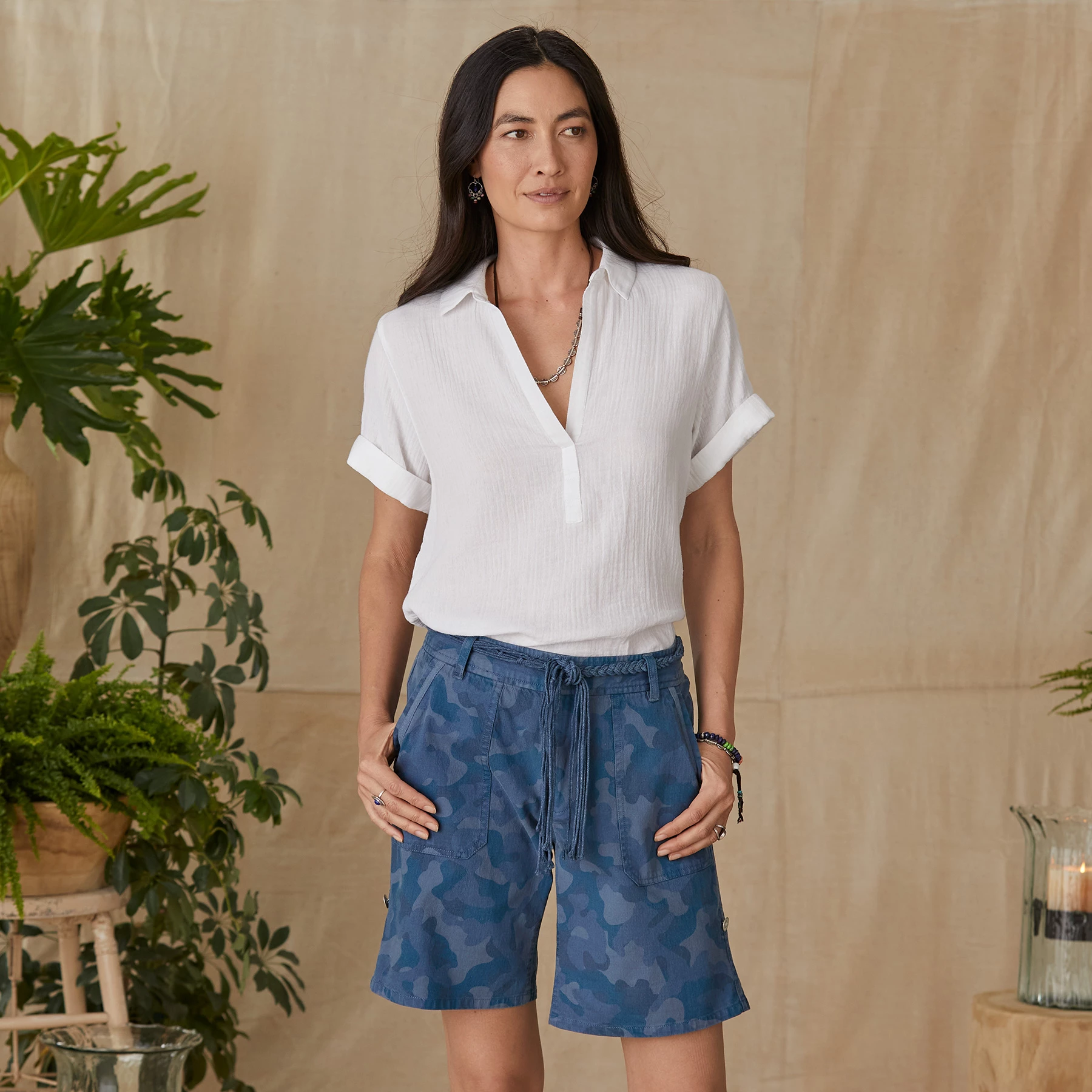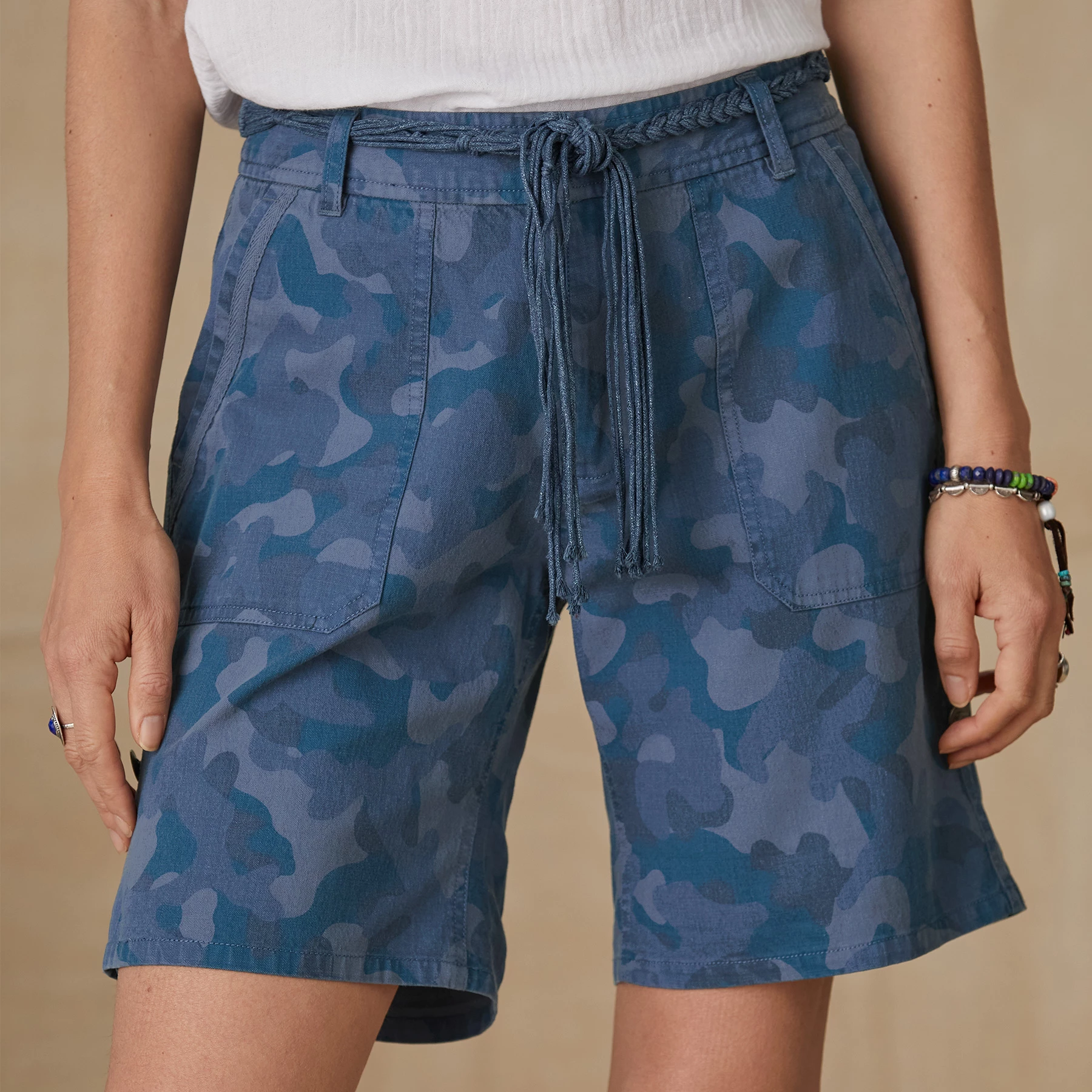 Classic, straight-cut shorts with removable macrame belt. Rolled hem with roll-tabs, antiqued five-button fly. Cotton/spandex. Machine wash. Imported. Exclusive. Sizes 0 to 14. 7-1/2″ inseam.