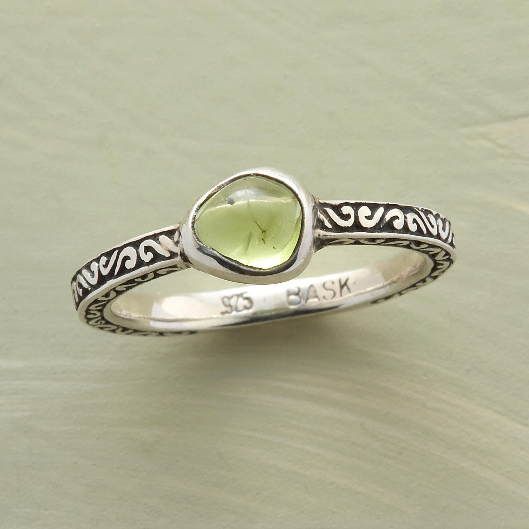 An irregular organic peridot ring, unique in all the world, with a custom bezel to match. The sterling silver band is set with end-to-end scrolls. Exclusive. Whole and half sizes 5-9.