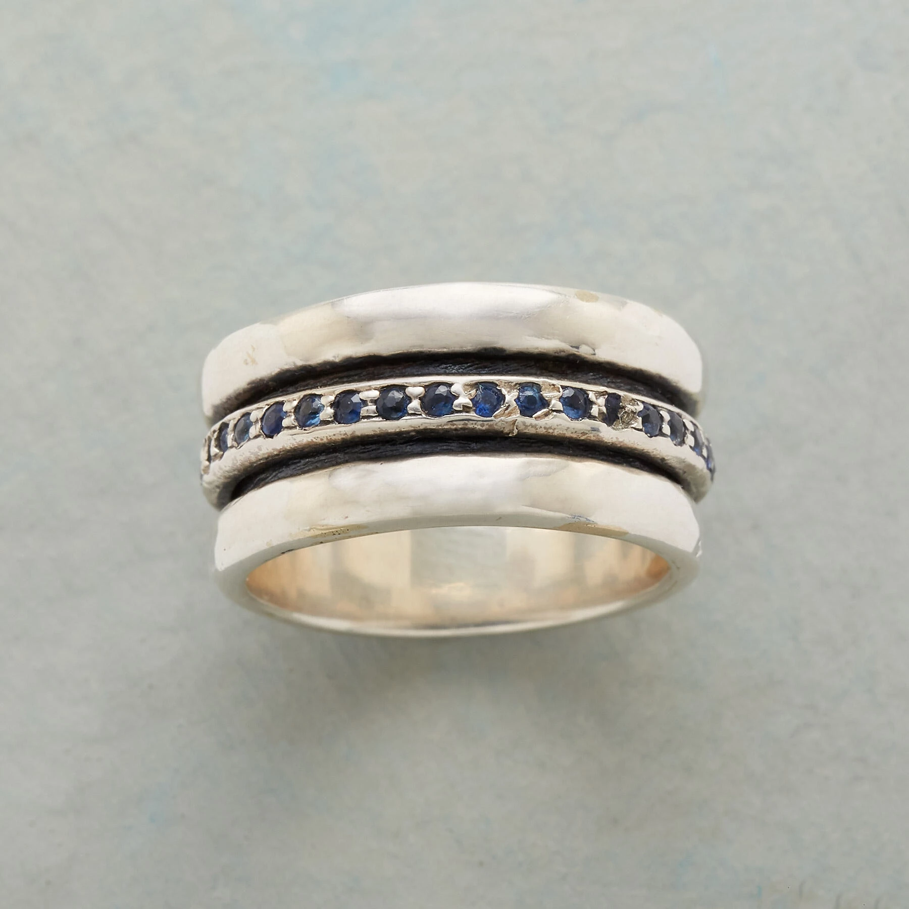 Shored by polished sterling, faceted sapphires set in a slender sterling spinner flow. ‘Outer Banks Ring’ hand cast exclusively for Sundance. Exclusive. Whole sizes 5 to 9. This ring is licensed under U.S. patent nos. 6,497,117 and 6,295,732.