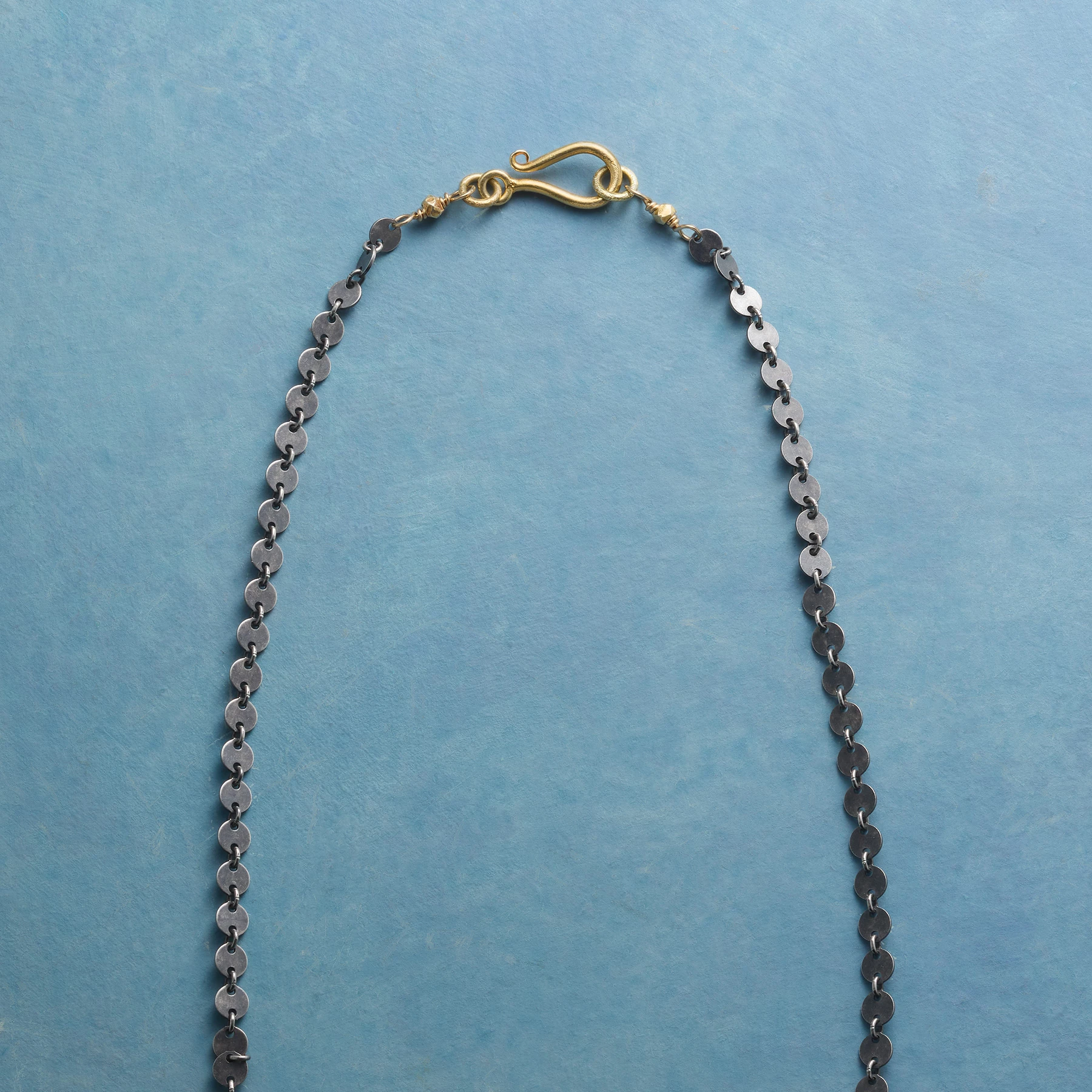A single white topaz floats amid the cerulean blues of kyanite in a necklace to wear dramatically long or lavishly doubled. Facets spark light across the organically shaped stones, and 22kt gold-vermeil accents glow alongside the oxidized sterling silver bezels and links. Hook clasp. Handcrafted in USA. 40″L.