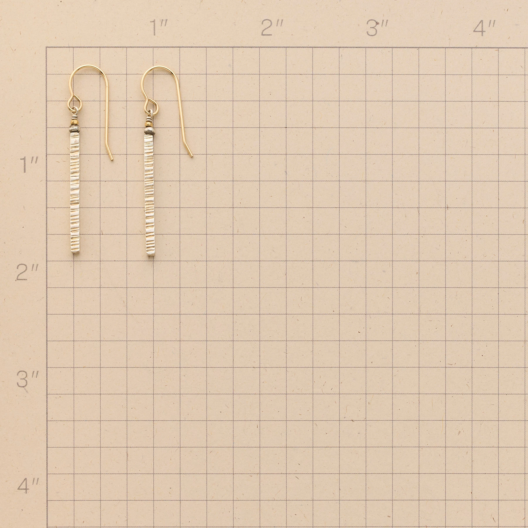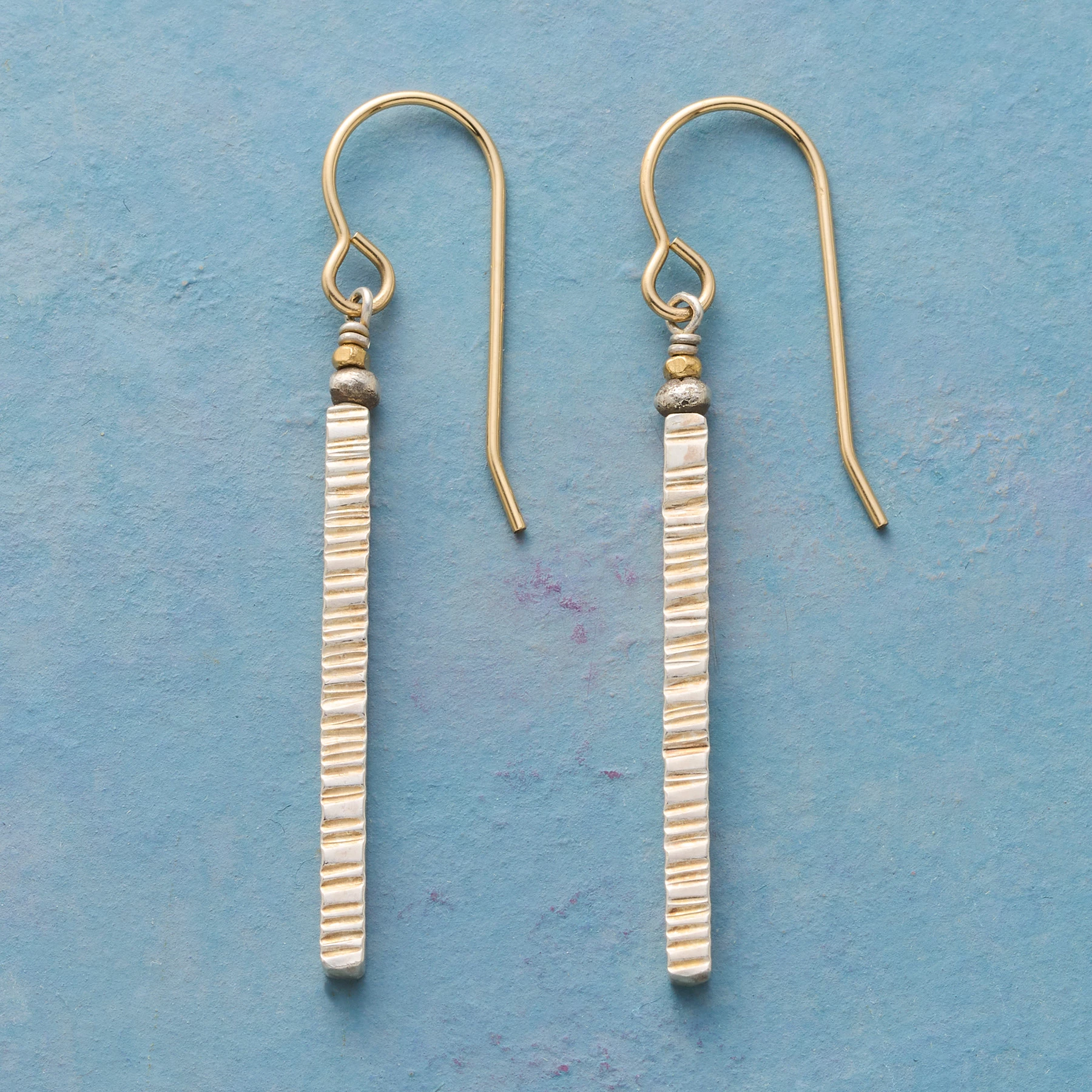 Statuesque pillars of sterling silver swing gracefully, their front surfaces marked with light-catching linear progressions. 14kt gold-filled French wires and beads. Handcrafted in USA. Exclusive. 1-3/4″L.