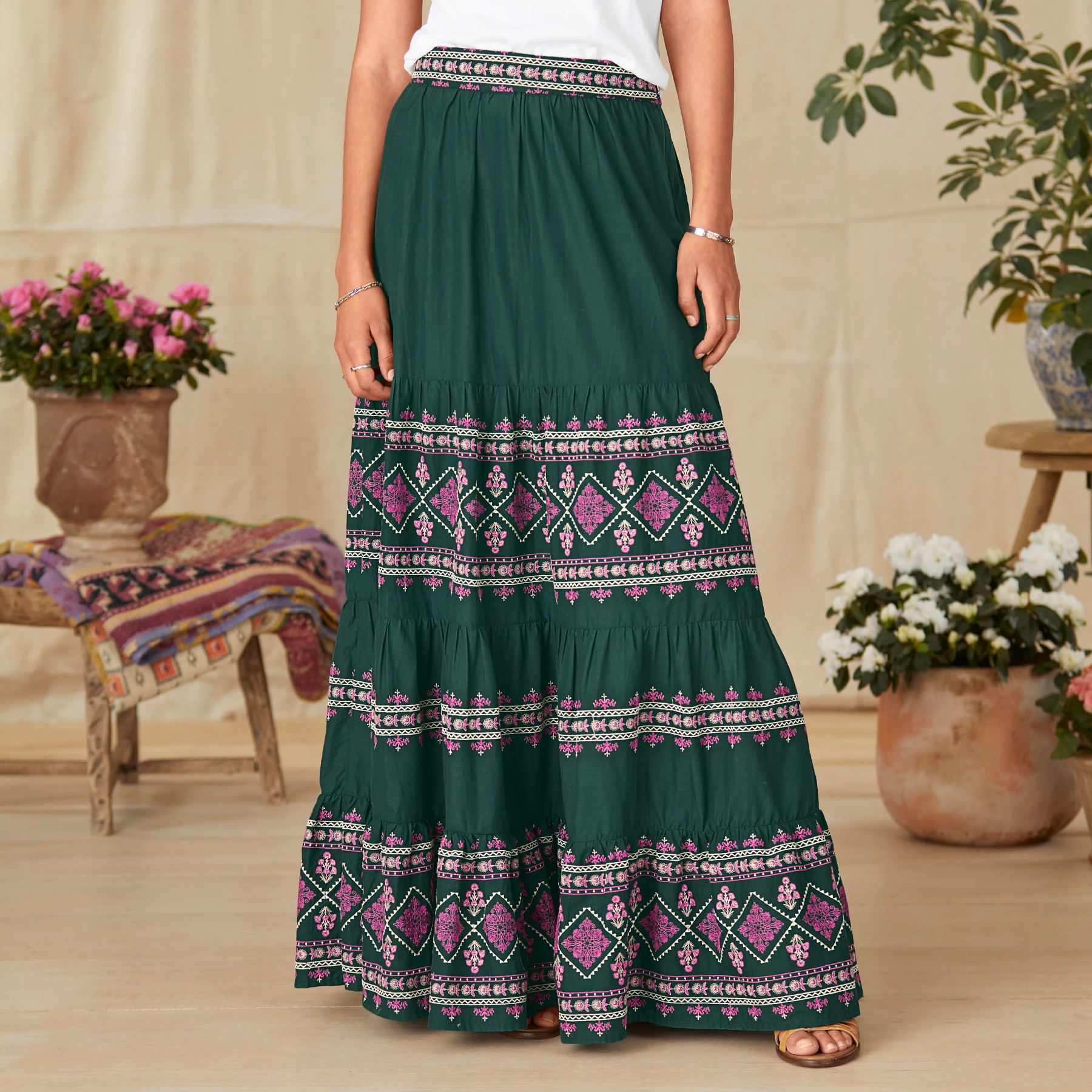 This relaxed skirt is enhanced with geometric embroidery at the waist and at each of the tiers. Side zip. Cotton. Hand wash. Imported. Sizes XS (0–2), S (4–6), M (8–10), L (12–14), XL (20–22). Approx. 41″L.