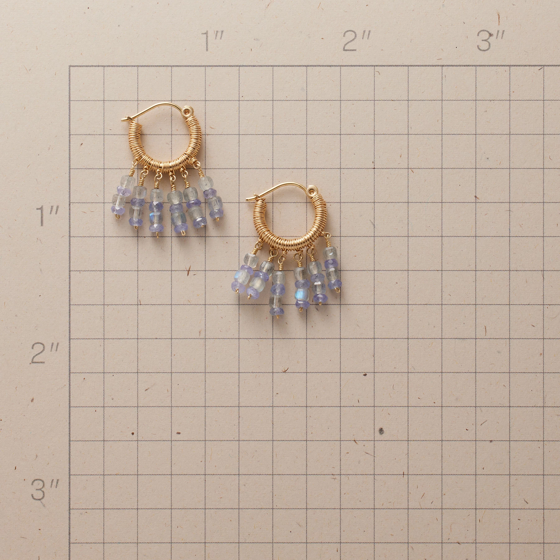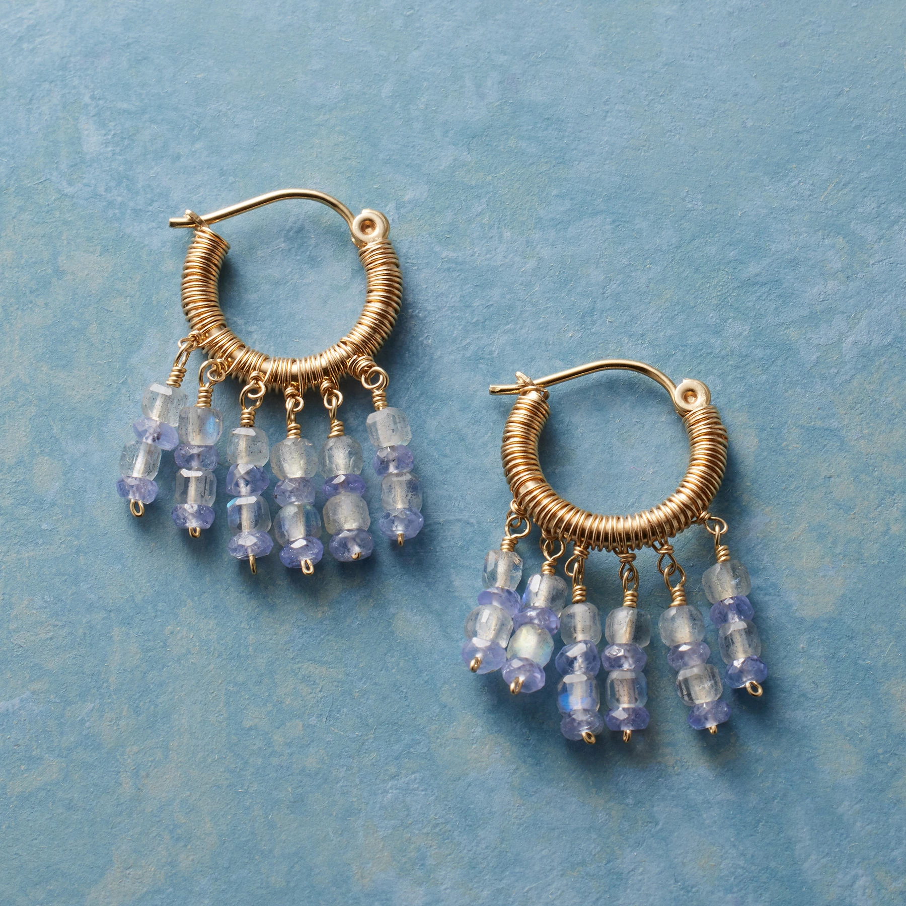 Tanzanite plays the blues, alternating with the ever-shifting hues of labradorite, while intricate 14kt gold wire wrapping sets up its own rhythm in handcrafted hoops by Dana Kellin. Self-locking wires. Made in USA. 1″L.