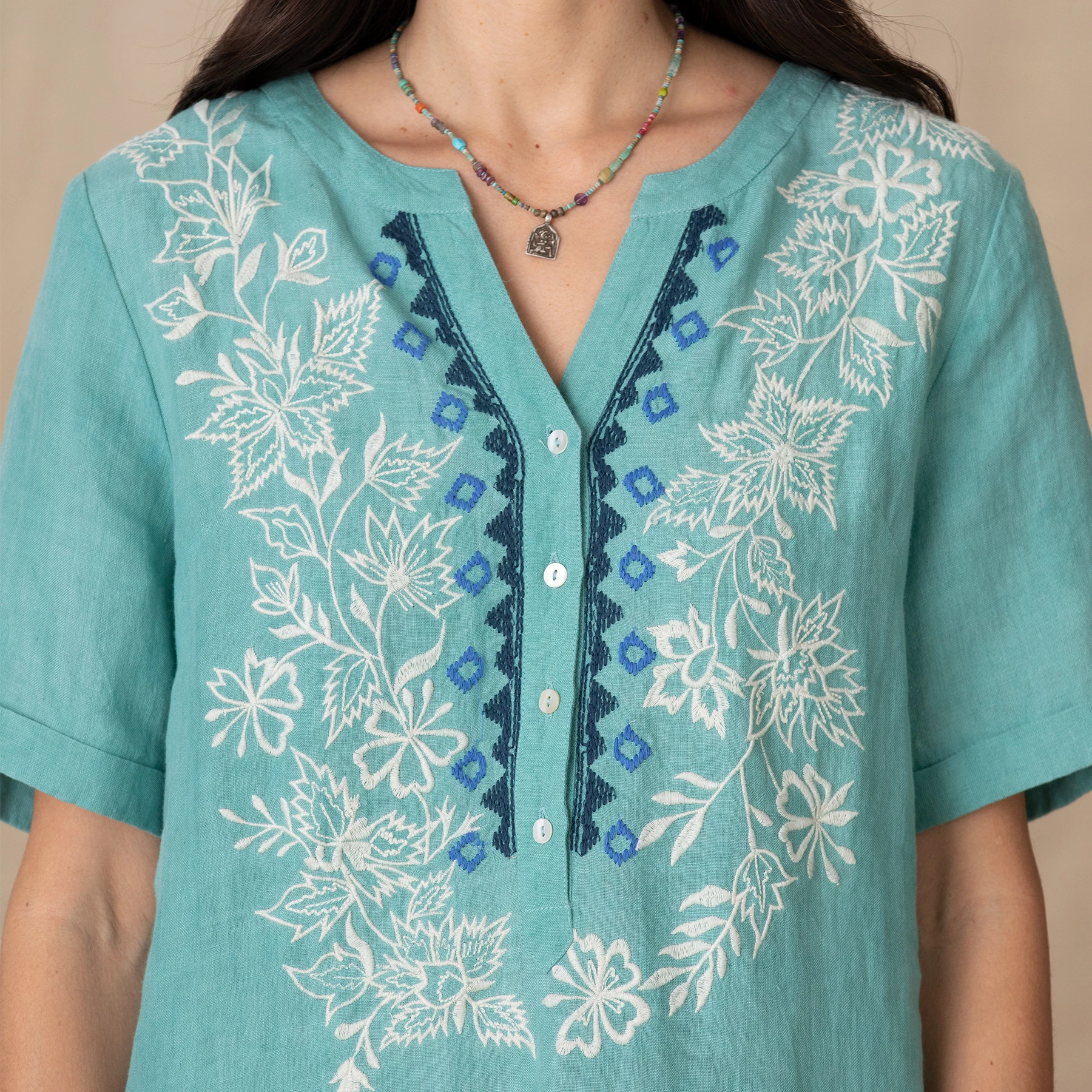 Embrace the warm weather seasons in this beautifully embroidered linen dress. Henley placket with shell buttons, rolled sleeves, self belt, deep side slits and on-seam pockets. Machine wash. Imported. Exclusive. Sizes XS (0 to 2), S (4 to 6), M (8 to 10), L (12 to 14), XL (16 to 18), XXL (20 to 22). Approx. 52″L.