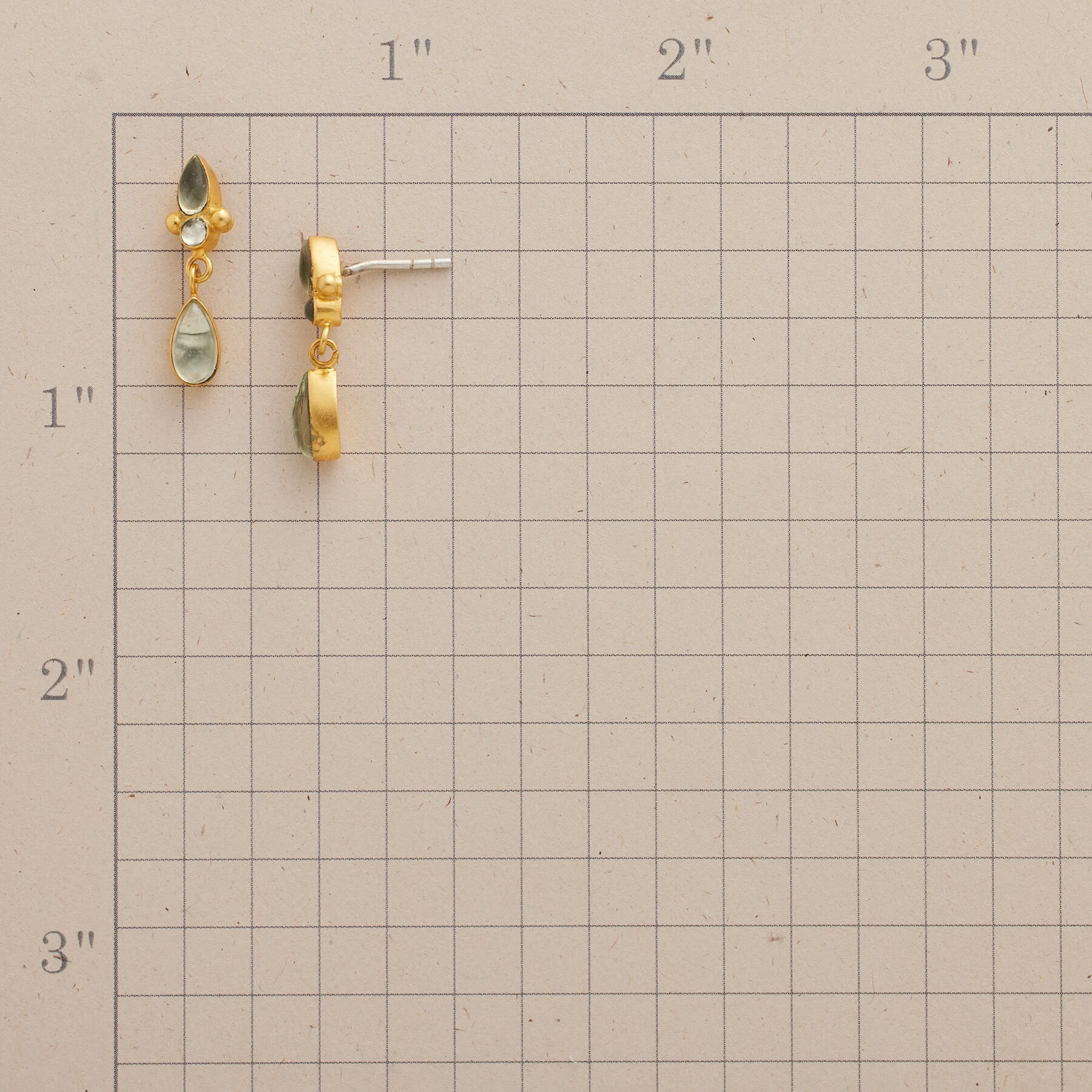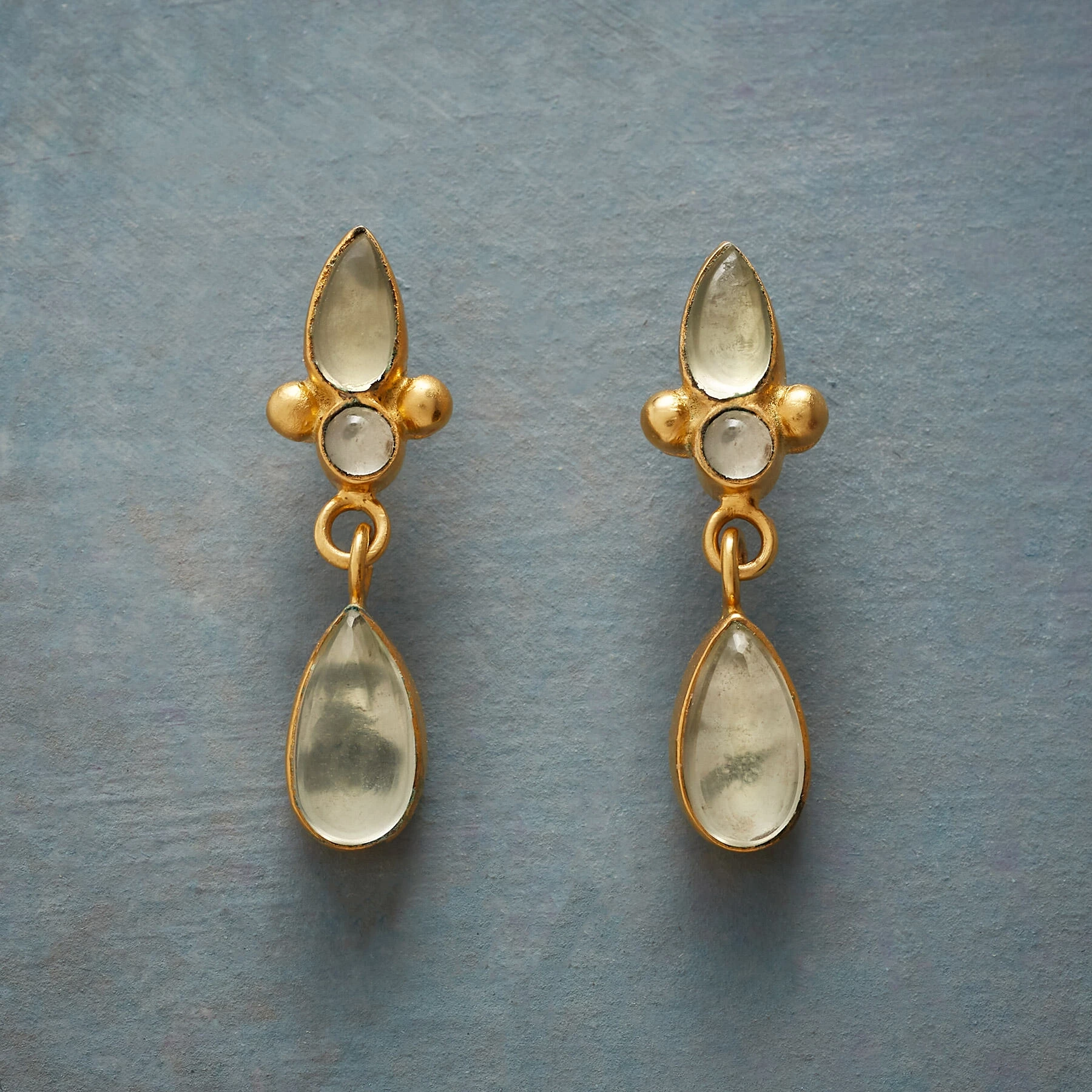 Foil lined bezels lend a shimmering gray-green glow to clear quartz gemstones set in 10kt gold plate, with beaded accents of matching metal. Handcrafted by Jane Diaz. Posts. 7/8″L.