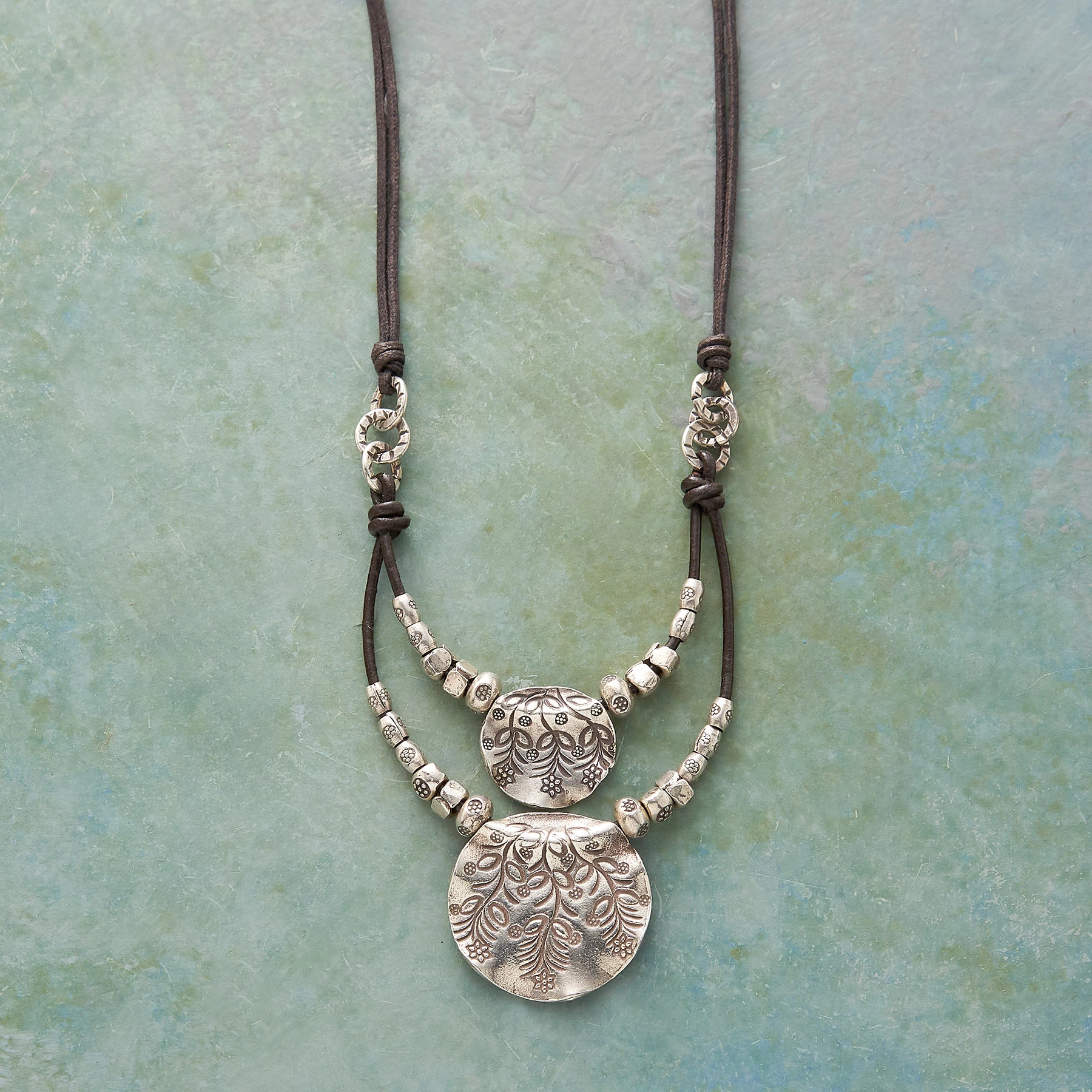 Stamped vines flow across wavy disks hung in a double arc on knotted leather laces. Handcrafted with Thai silver design elements, sterling silver toggle clasp. Exclusive. 18″L.