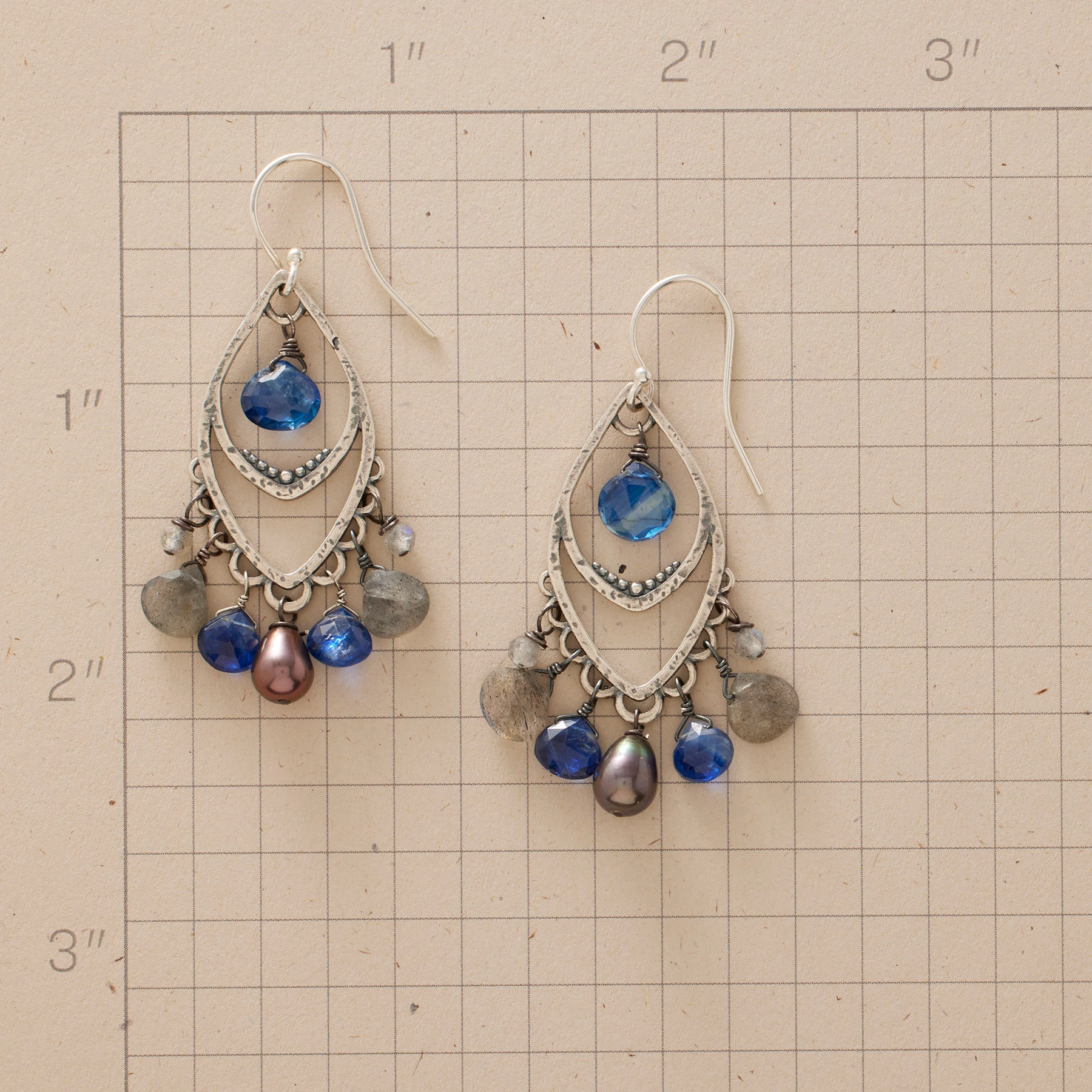 Kyanite, labradorite and cultured freshwater pearls rain down from sterling silver frames in a splash of stormy blue. Sterling French wires. Handcrafted in USA. Exclusive. 2″L.