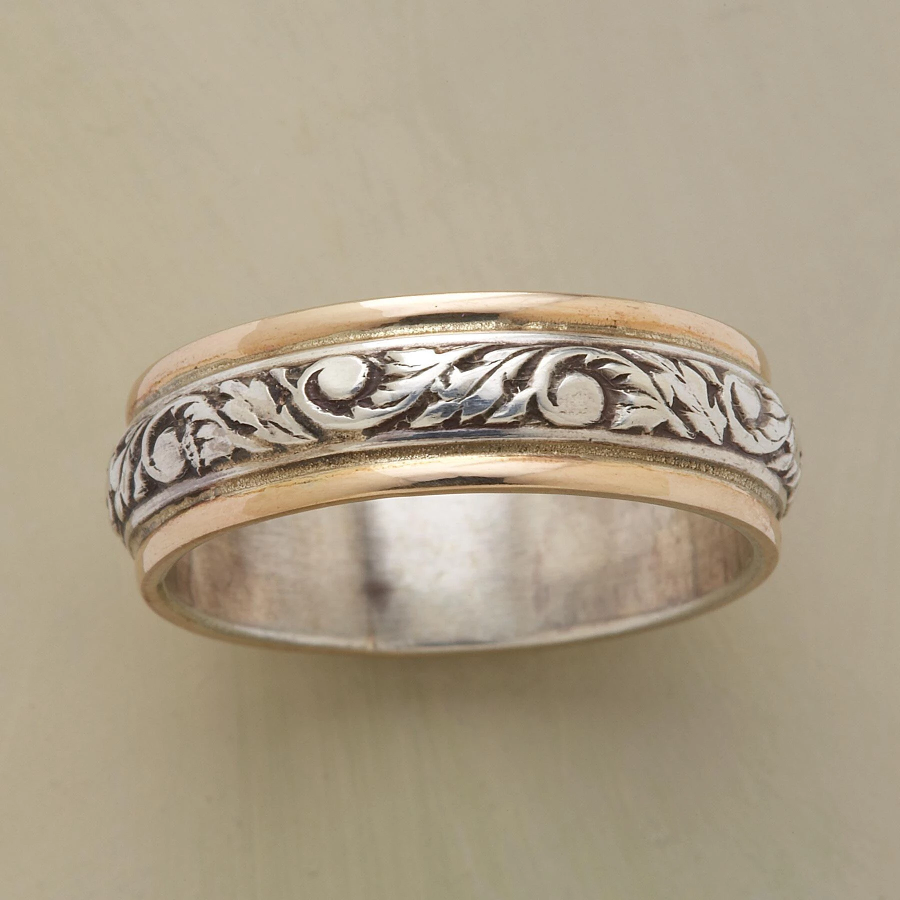 A silver and gold band ring features a leafy vine, sculpted in sterling silver, edged by borders of 14kt gold. Handmade by Chris Dungan. Whole sizes 5 to 9.