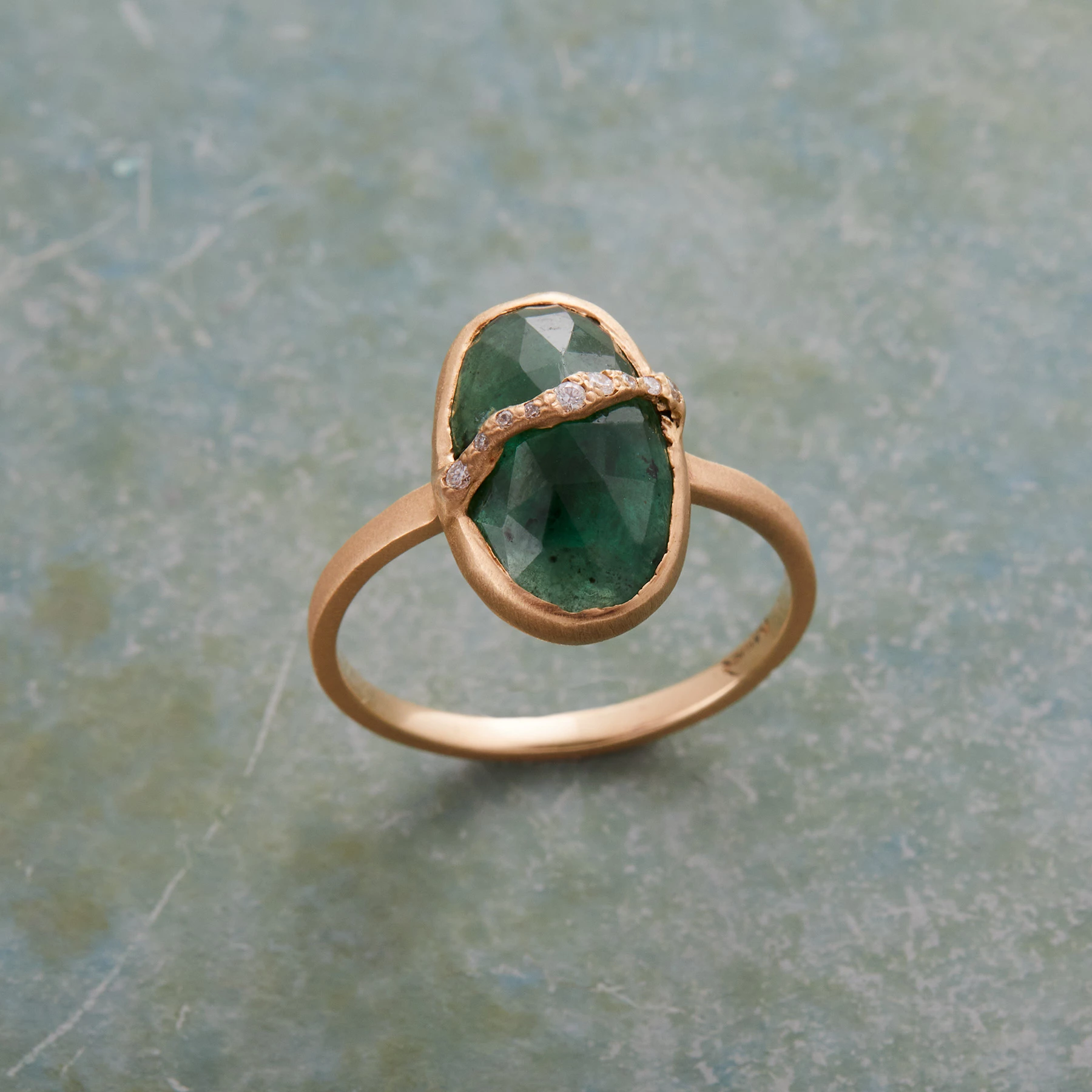 A rippling wave radiant with diamond sparkle flows across Jennifer Dawes’ emerald solitaire. Matte 14kt gold. Exclusive. Handmade in USA. Whole sizes 5 to 9.
