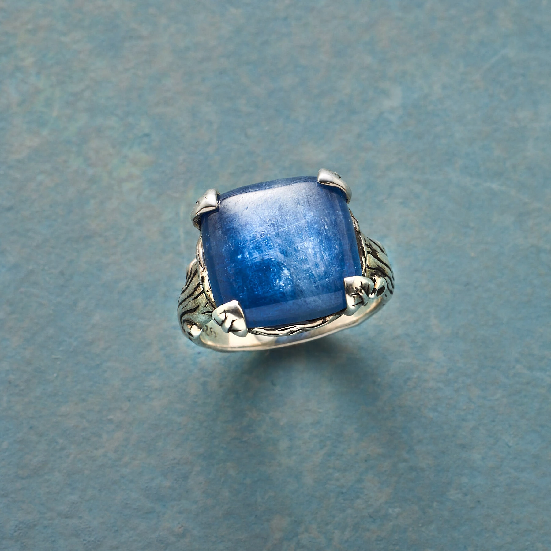 Our sterling silver faux bois ring holds a square of kyanite like a patch of blue sky in its leafy canopy. Handcrafted. Exclusive. Whole sizes 5 to 9.