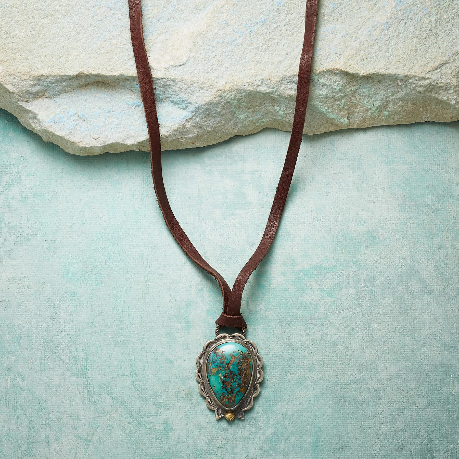 Master silversmith Jesse Robbins sets his hand-stamped sterling silver pendant with a dramatic cabochon of turquoise from Nevada’s Royston mine, founded in the early 1900s. Richly varied in color and matrix, it’s strung on soft leather with a coin-silver slider. Handmade in USA. Exclusive. Approx. 38″L, pendant 1-3/4″L x 1-1/8″W.
