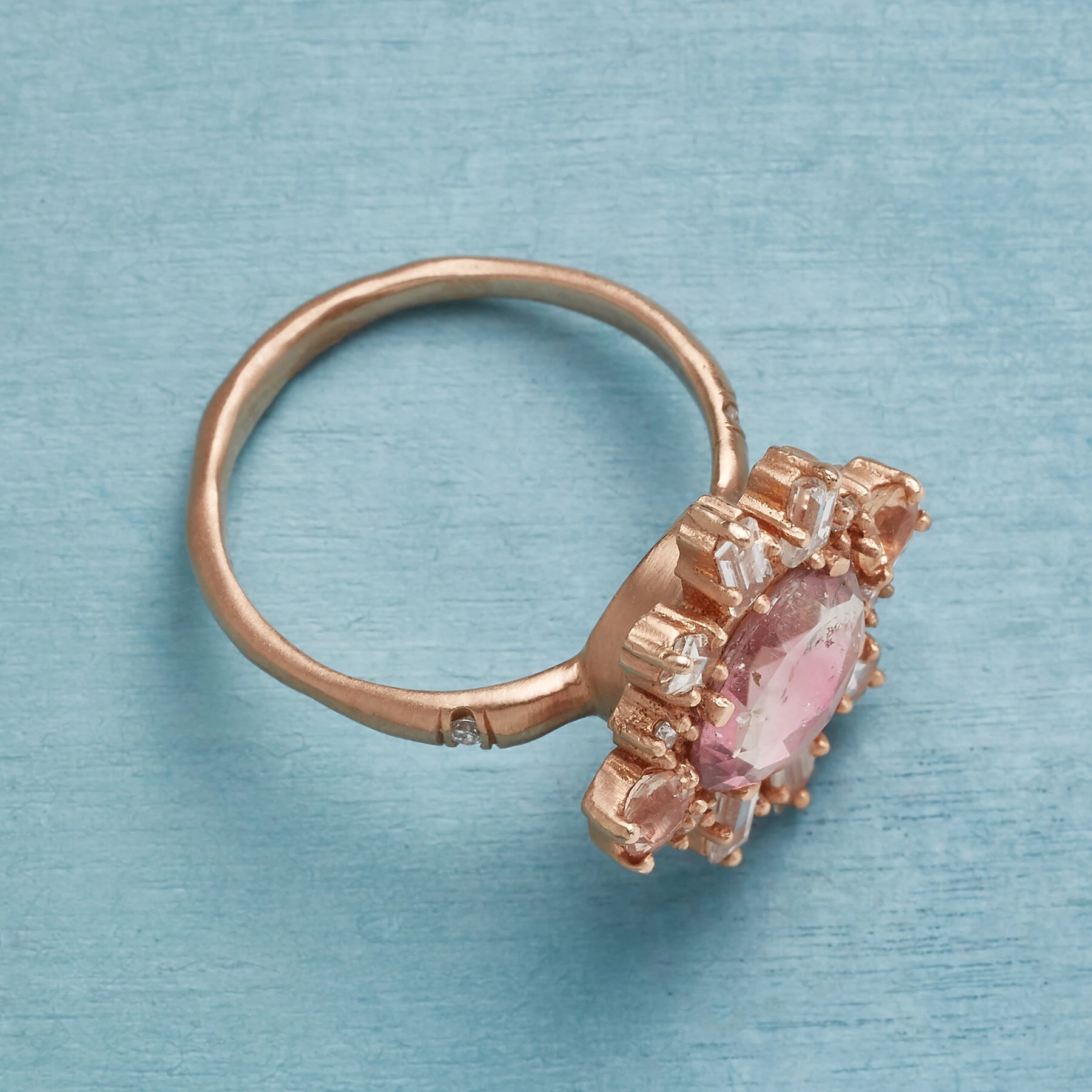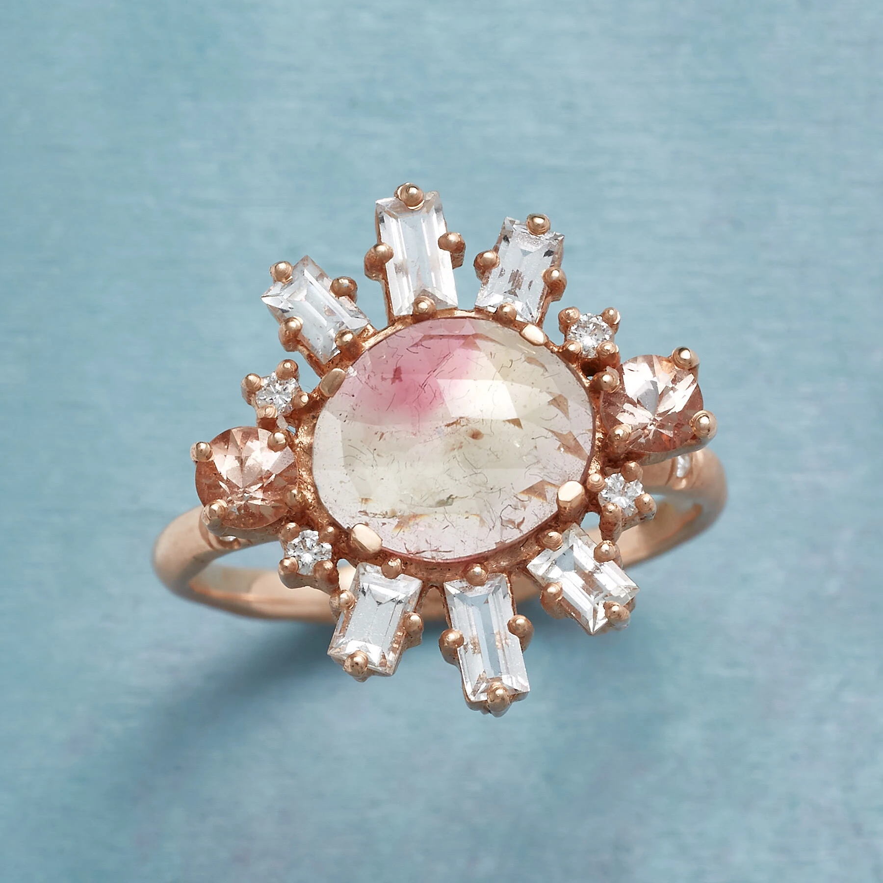 By Christopher and Mai, a handcrafted 14kt rose gold ring centered with an expertly faceted watermelon tourmaline surrounded by sparkling diamond, sapphire and imperial topaz. Made in USA. Exclusive. Whole sizes 5 to 9.