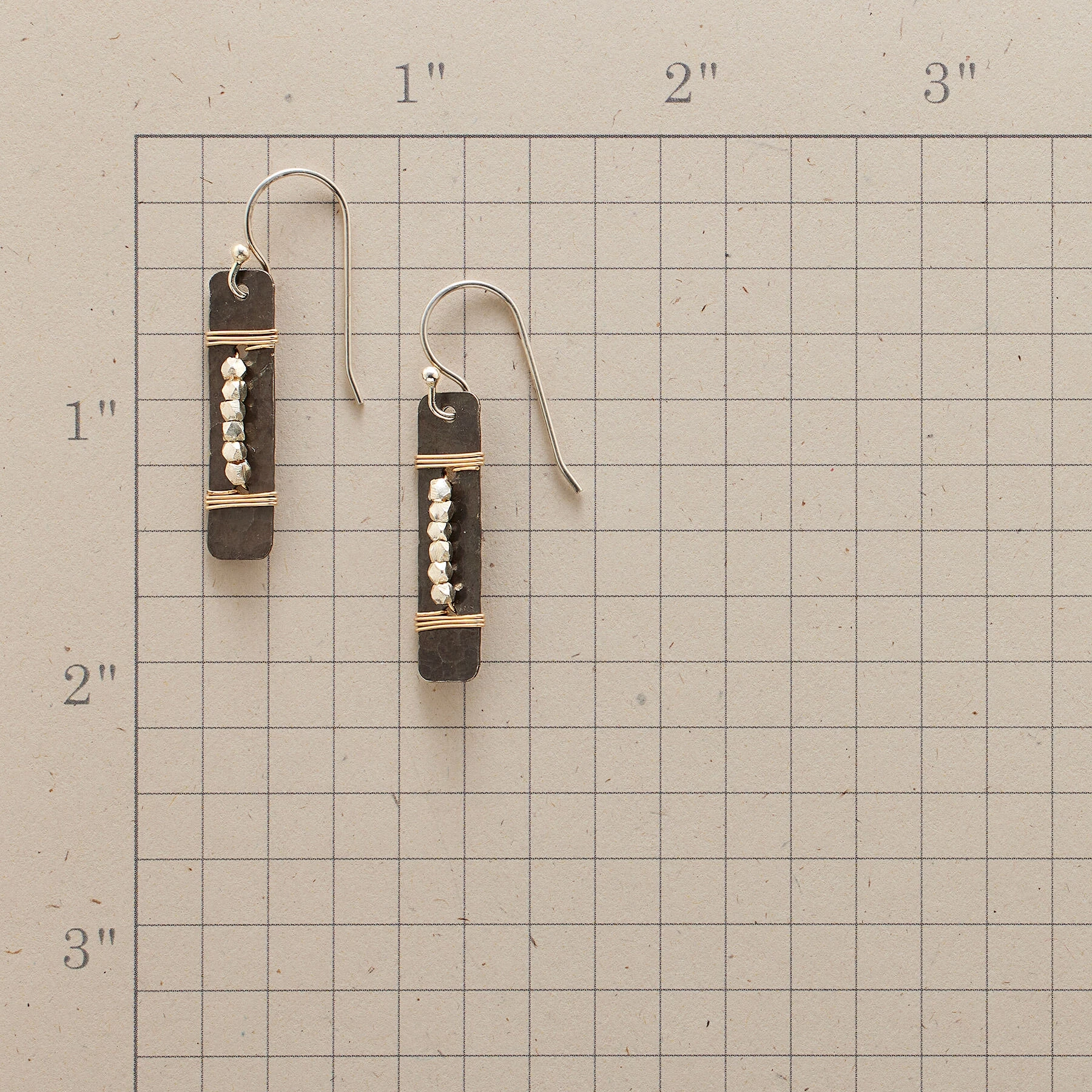 Bright, faceted beads of sterling silver queue up on 14kt gold-filled wire along a lane of hammered, oxidized sterling. French wires. Handcrafted in USA. Exclusive. 1-1/2″l.