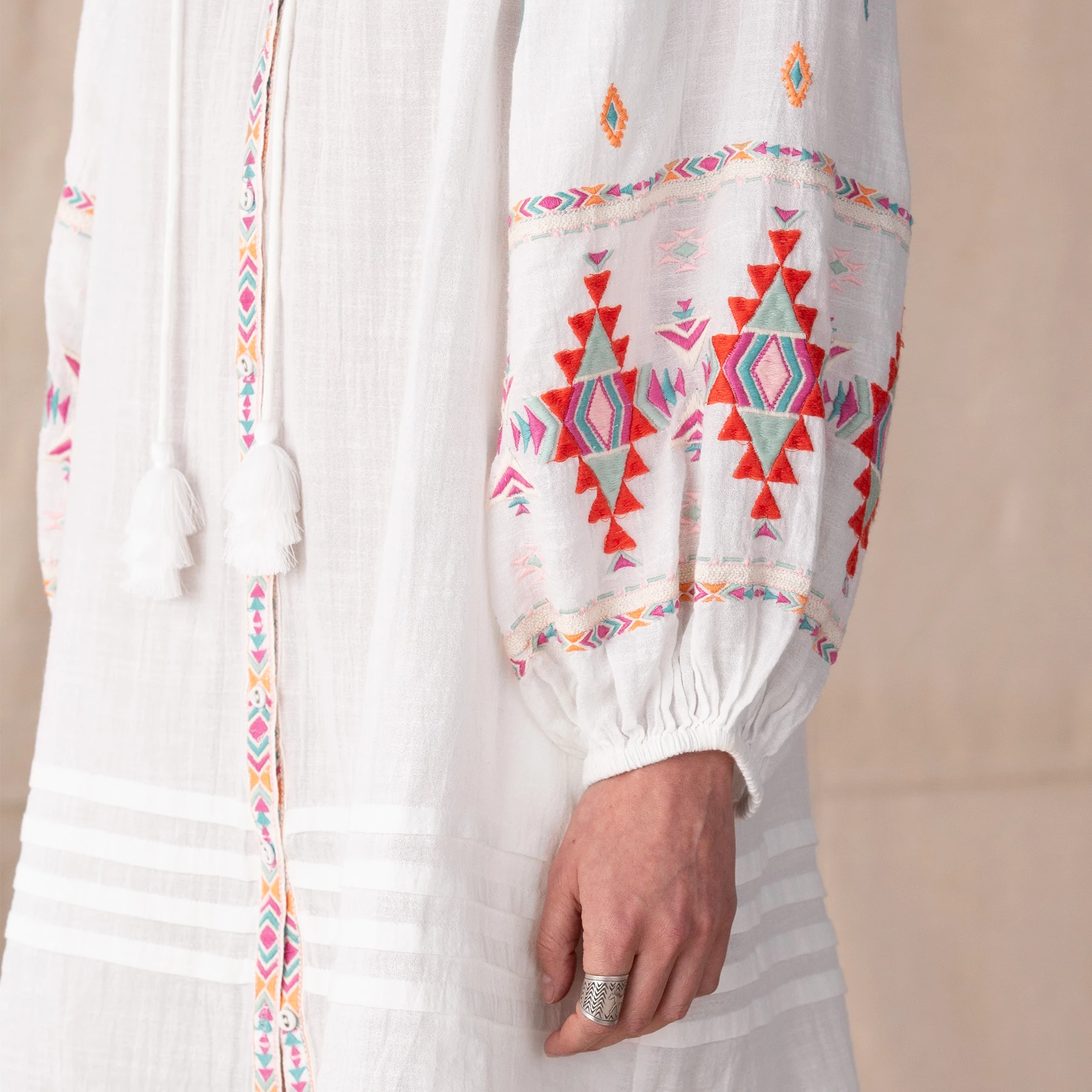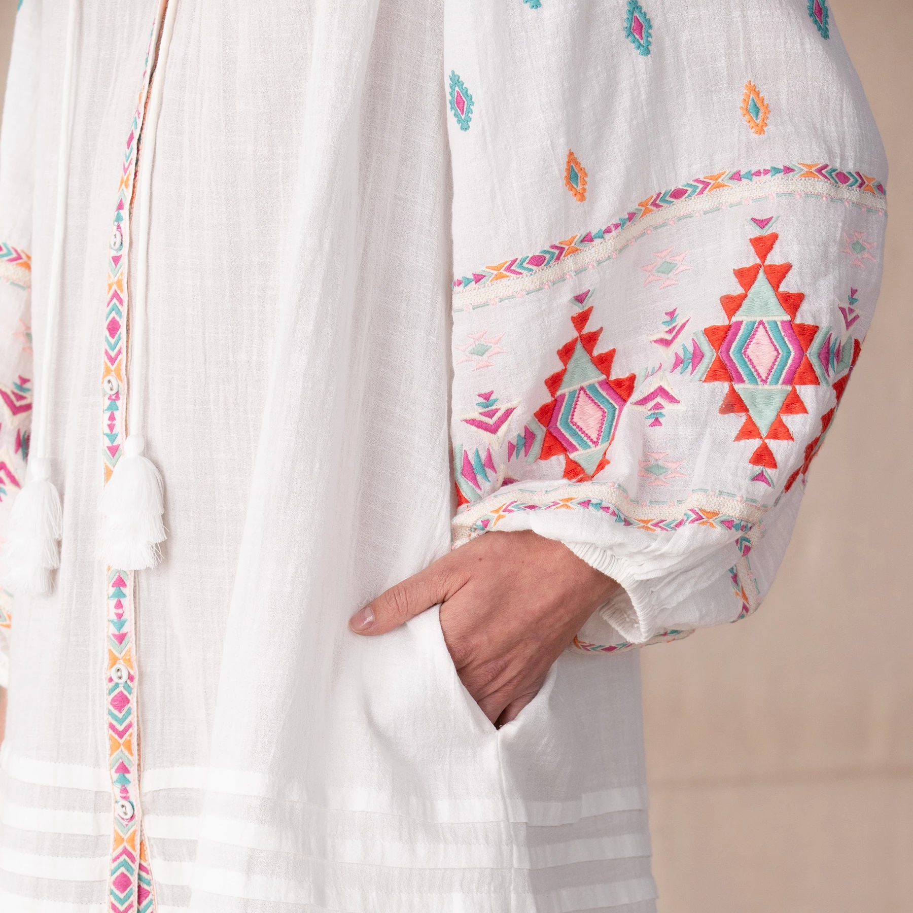 This bright and billowy, button down dress impresses with intricate embroidery and dramatic, full sleeves with banded cuffs. Gauzy and tiered with tassel neckline and pintucking, it makes a perfectly stunning cover-up. Cotton. Machine wash. Imported. Exclusive. Sizes XXS (00), XS (0 to 2), S (4 to 6), M (8 to 10), L (12 to 14), XL (16 to 18). Approx. 32-1/2″L.
