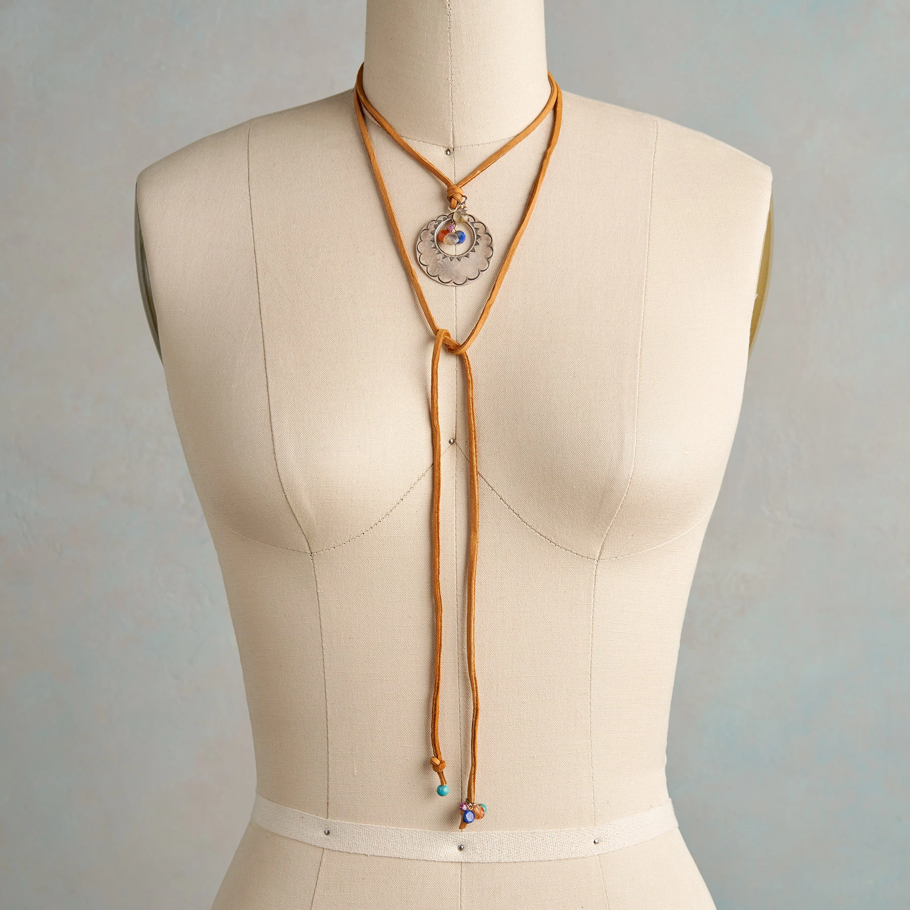Hand stamped on Thai silver, sunrays and scallops surround a clutch of colorful gems. More sparklers trim the soft leather laces that let you wear this piece at whatever length you like. Gems include labradorite, lapis, tinted red onyx and ruby and enhanced, stabilized turquoise. 14kt gold-filled headpins. Handcrafted. Exclusive. 53″l, 1-1/2″ drop.
