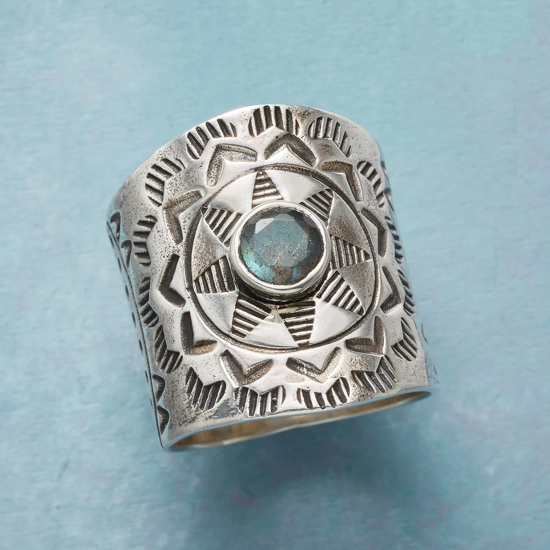 Starburst stampings oxidized for emphasis radiate from a center-set labradorite on a bold expanse of sterling silver. Handcrafted in whole sizes 5 to 10. 7/8″ tapers to 1/2″W.