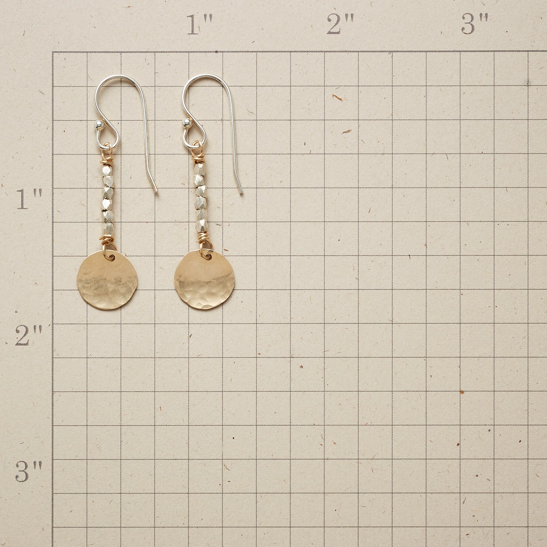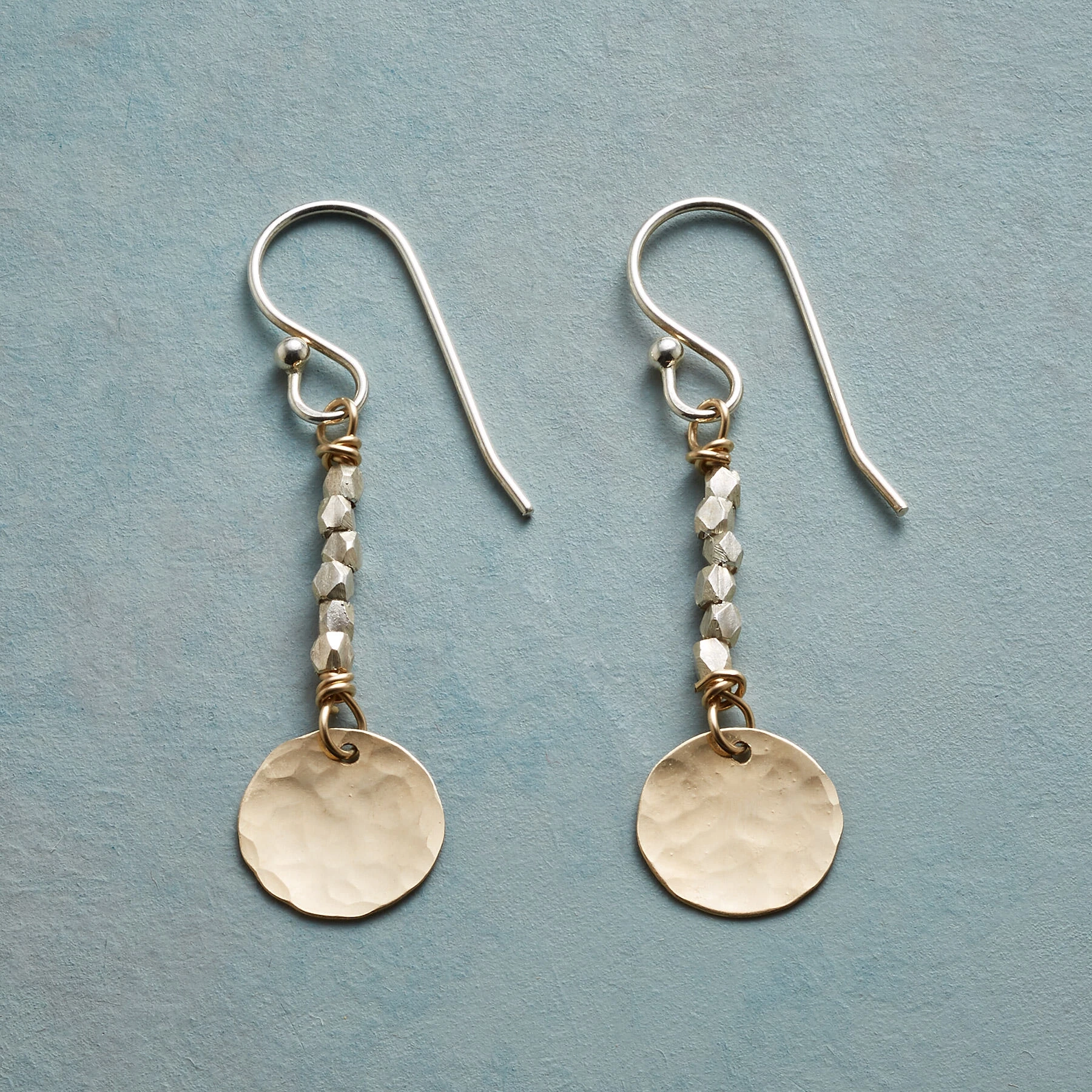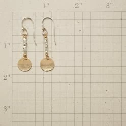 A pairing of 14kt gold-filled disks suspended from sterling silver bead strands was inspired by sunlight on fresh snow. Sterling wires. Handmade in USA. Exclusive. 1-3/4″L.