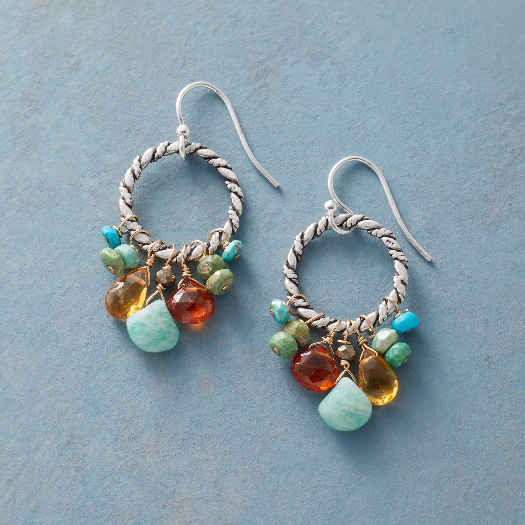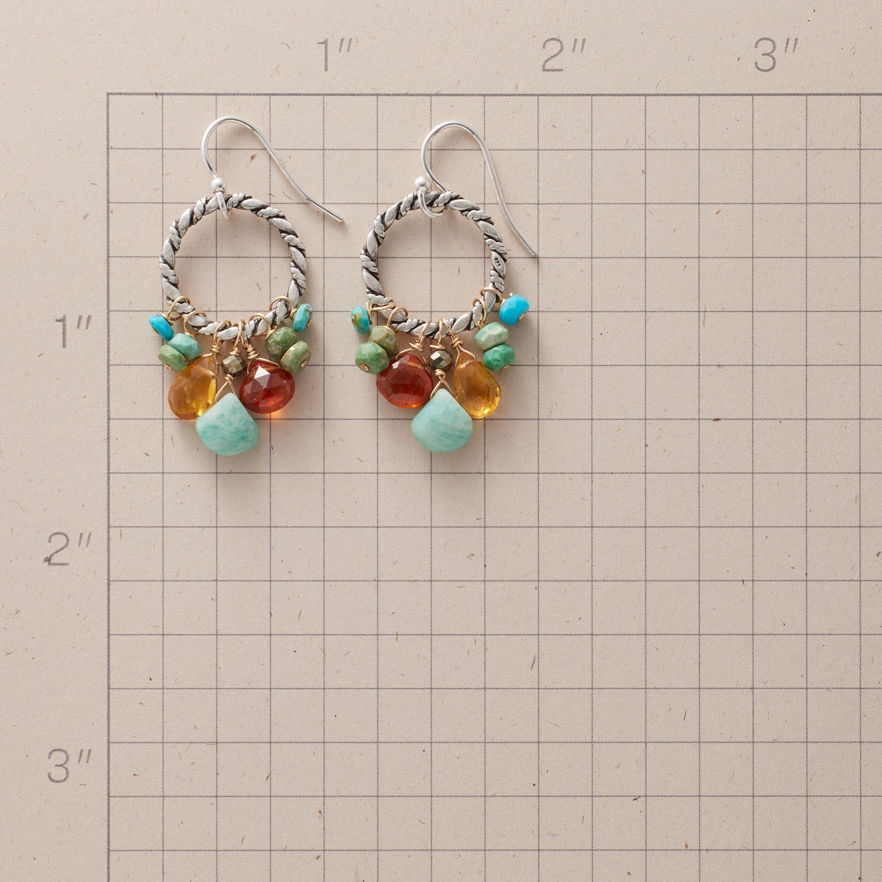 Loops of rope-twisted sterling silver lasso a bevvy of gems, including hessonite garnet, citrine, pyrite, amazonite and both natural and enhanced turquoise. Sterling French wires. Handcrafted in USA. Exclusive. 1-1/4″l.
