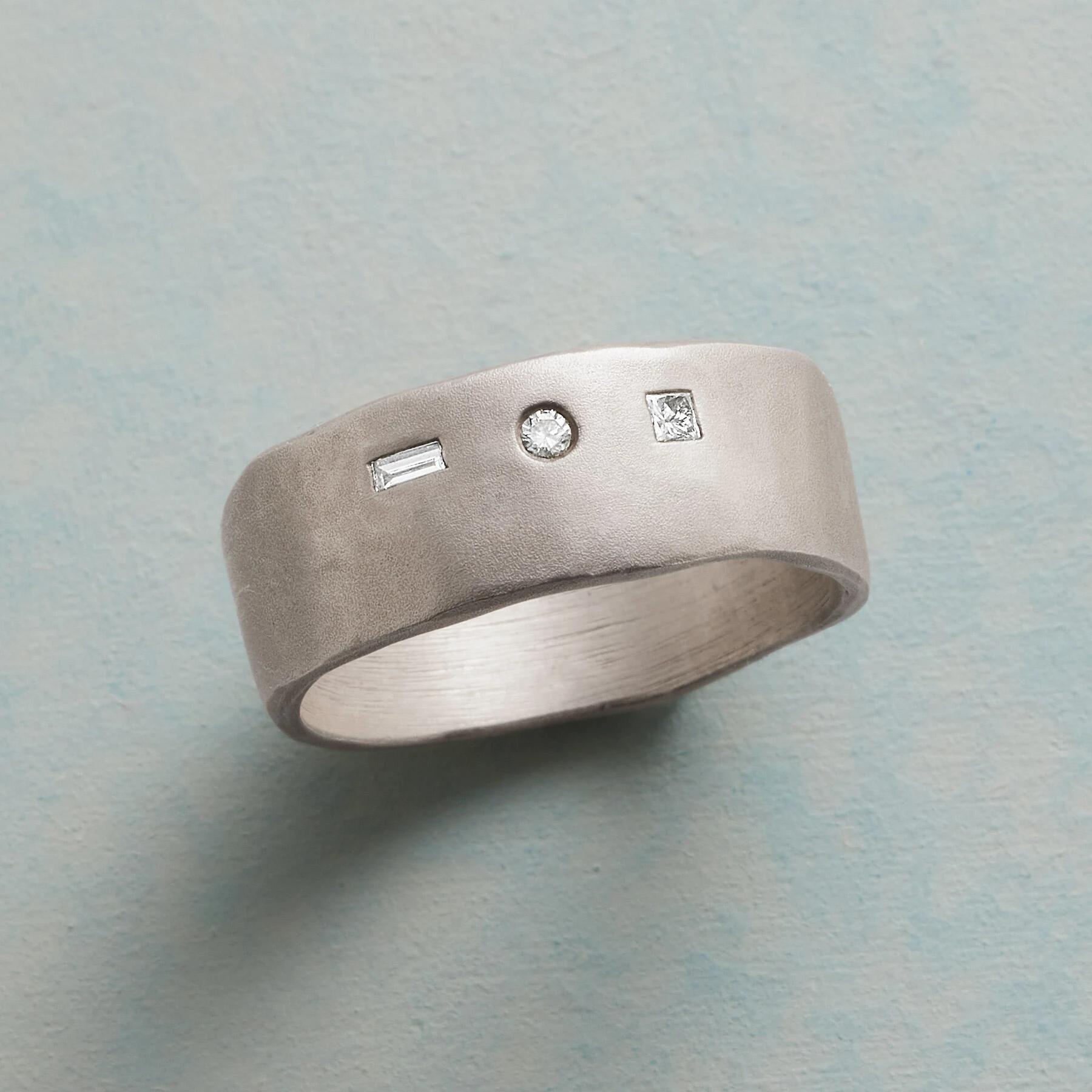 Matte sterling silver plays hosts to three diamonds in expert cuts —baguette, round and princess—with equal sparkle. By Sandra Messinger. USA. Whole sizes 5 to 9.