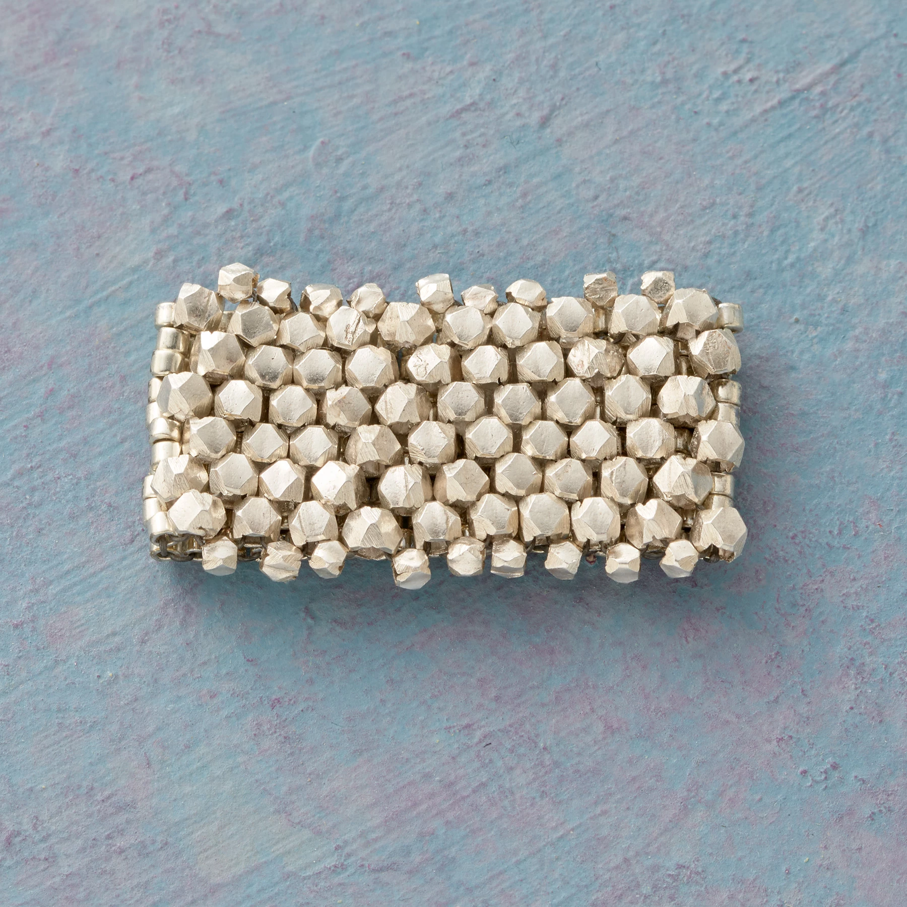 To craft this ring, artisans employ an off-loom weaving technique that dates to ancient Egypt…a blend of ages and cultures. Thai silver and Japanese glass beads. Whole sizes 6 to 10. 5/8″W.