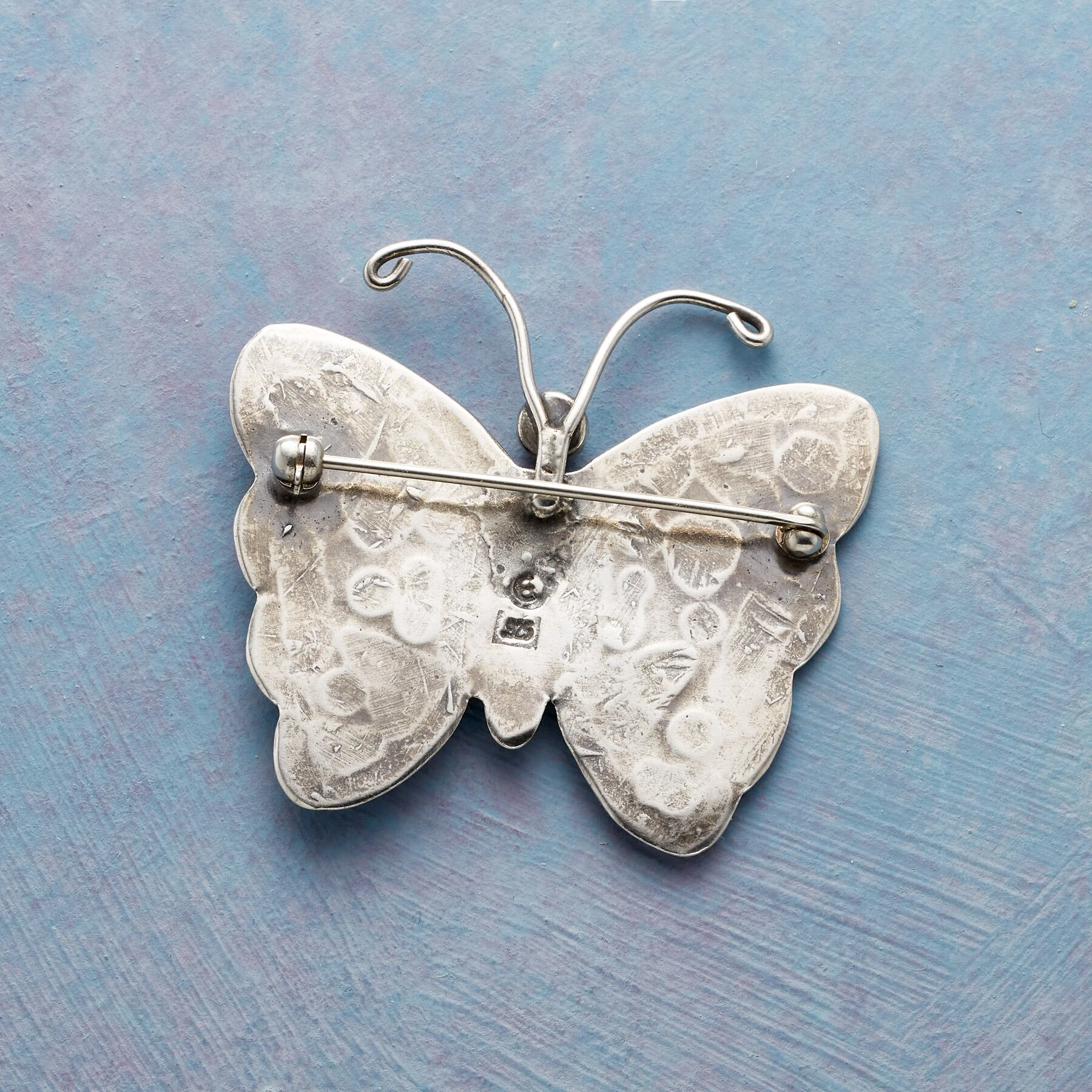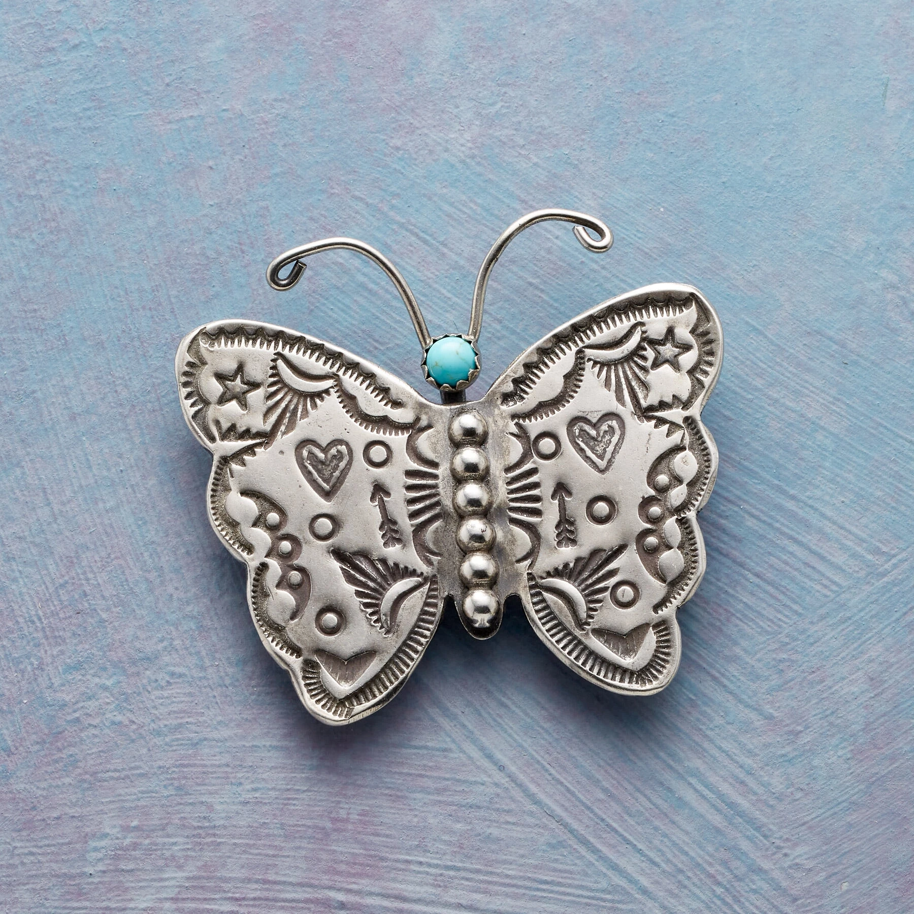 Texas silversmith Joe Eby celebrates his Navajo Nation roots, hand-stamping traditional symbols on the wings of a sterling silver butterfly. Set with turquoise and perfectly sized for a collar, lapel or hat. Handmade in USA. 1-1/2″L x 1-3/4″W.