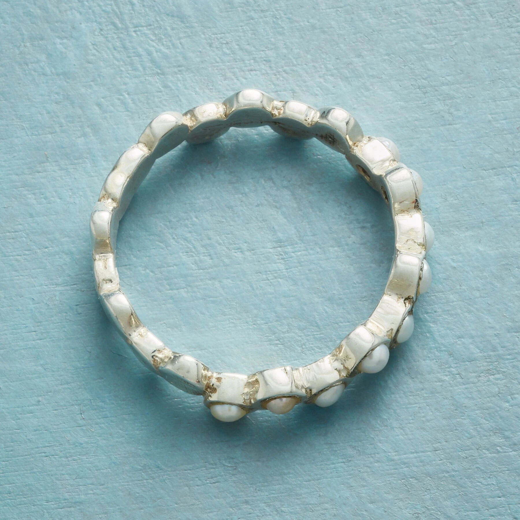 Tiny cultured freshwater pearl meanders across our ring like iridescent bubbles, leaving a trail of sterling silver dots in their wake. Handcrafted. Exclusive. Whole sizes 5-10.