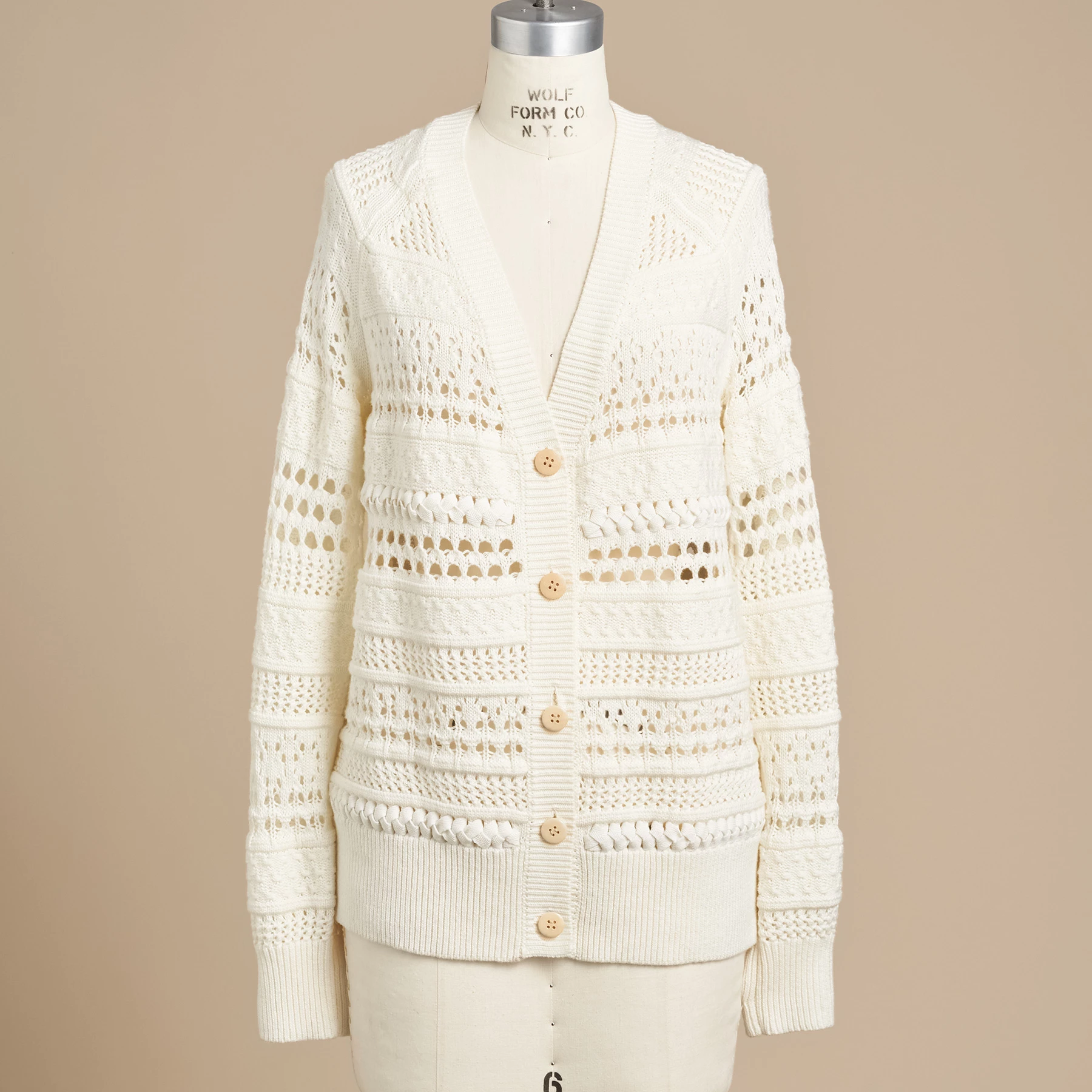 An airy and open, mixed-stitch cardigan with twill tape braided through the body of the sweater for marvelous texture. With rib trim and wooden buttons. Relaxed, easy fit. Cotton/acrylic. Hand wash. Imported. Exclusive. Sizes XXS (00), XS (0β2), S (4β6), M (8β10), L (12β14), XL (16β18). Approx. 22-1/2″l.