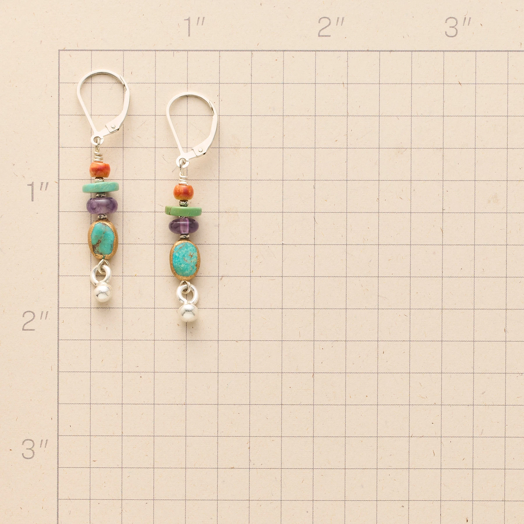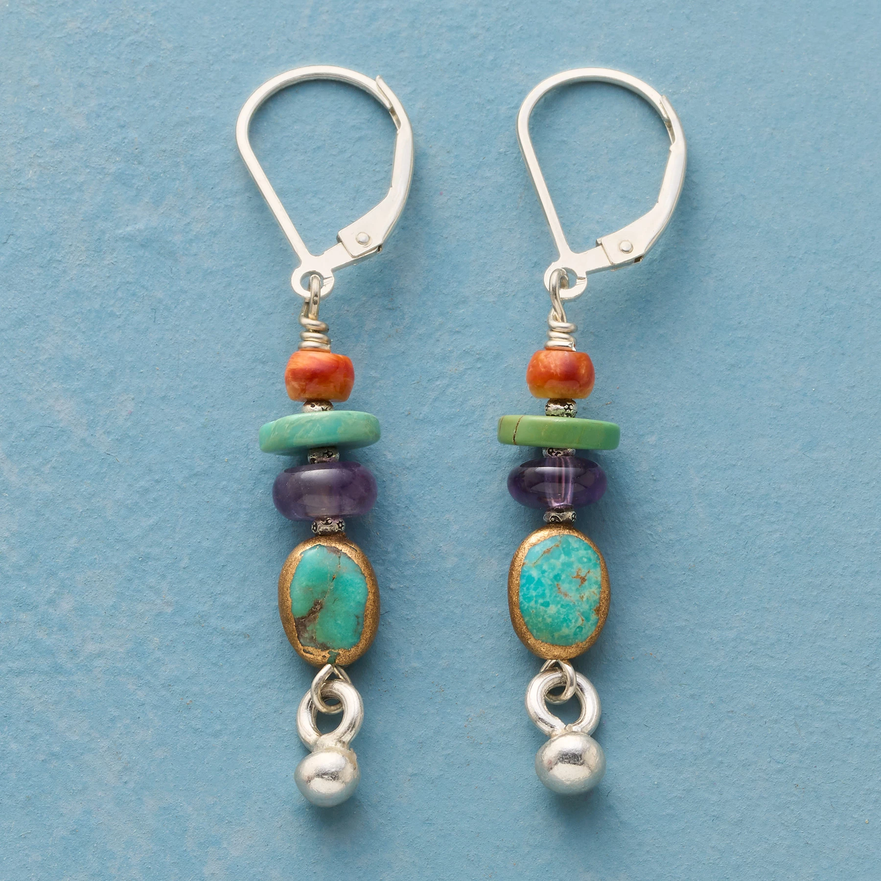 Starting with spiny oyster shell and ending with a Thai silver droplet, amethyst and turquoise fill the freefall in between. Exclusive. Handcrafted with copper bezel, sterling silver lever back wires. 1-3/4″l.