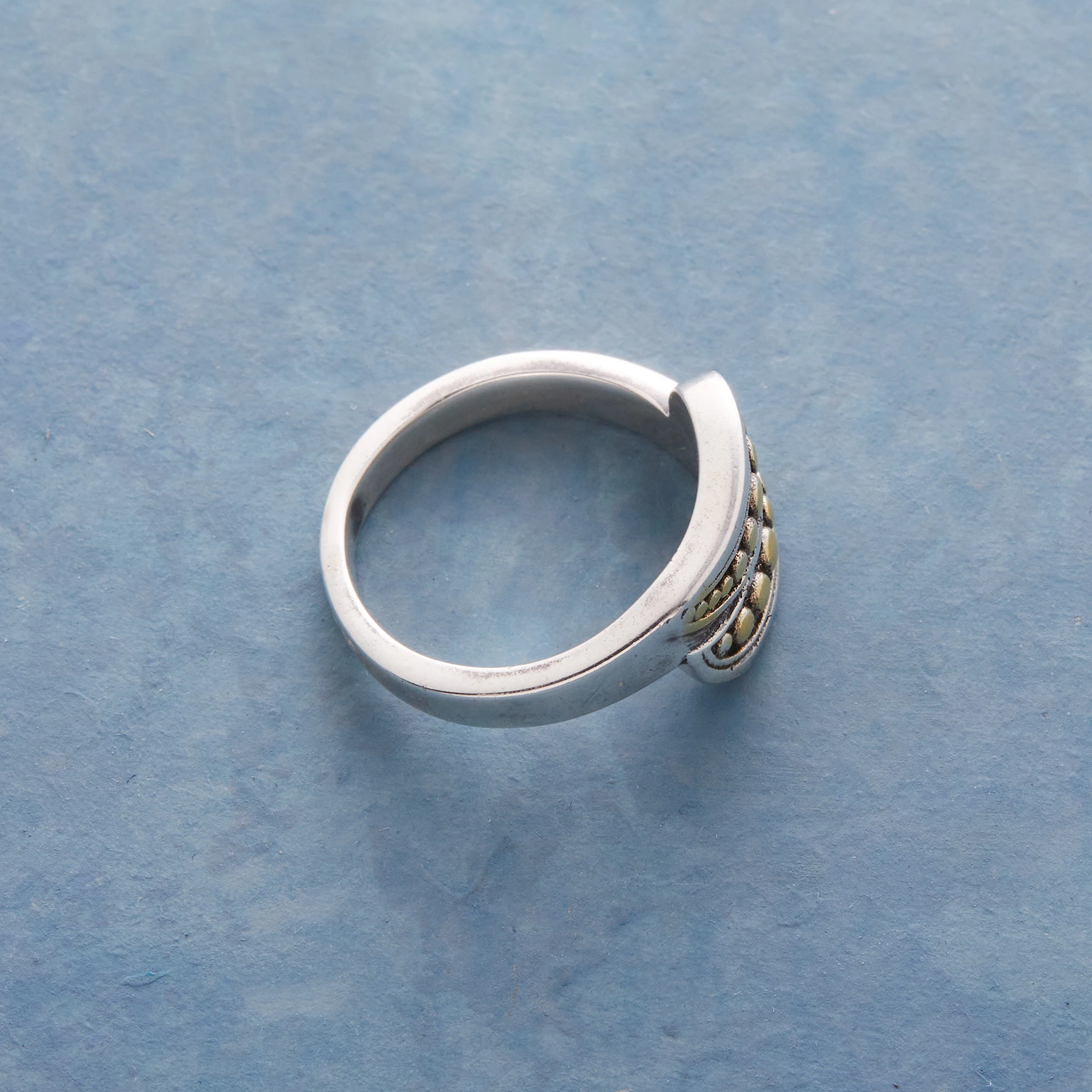 Nature’s influence is unmistakable as our band wraps asymmetrically from one peapod design element to the other. Sterling silver with oxidized channels and 14kt gold-plated beads. Exclusive. Whole sizes 5-10. 3/8″ tapers to 1/8″w.