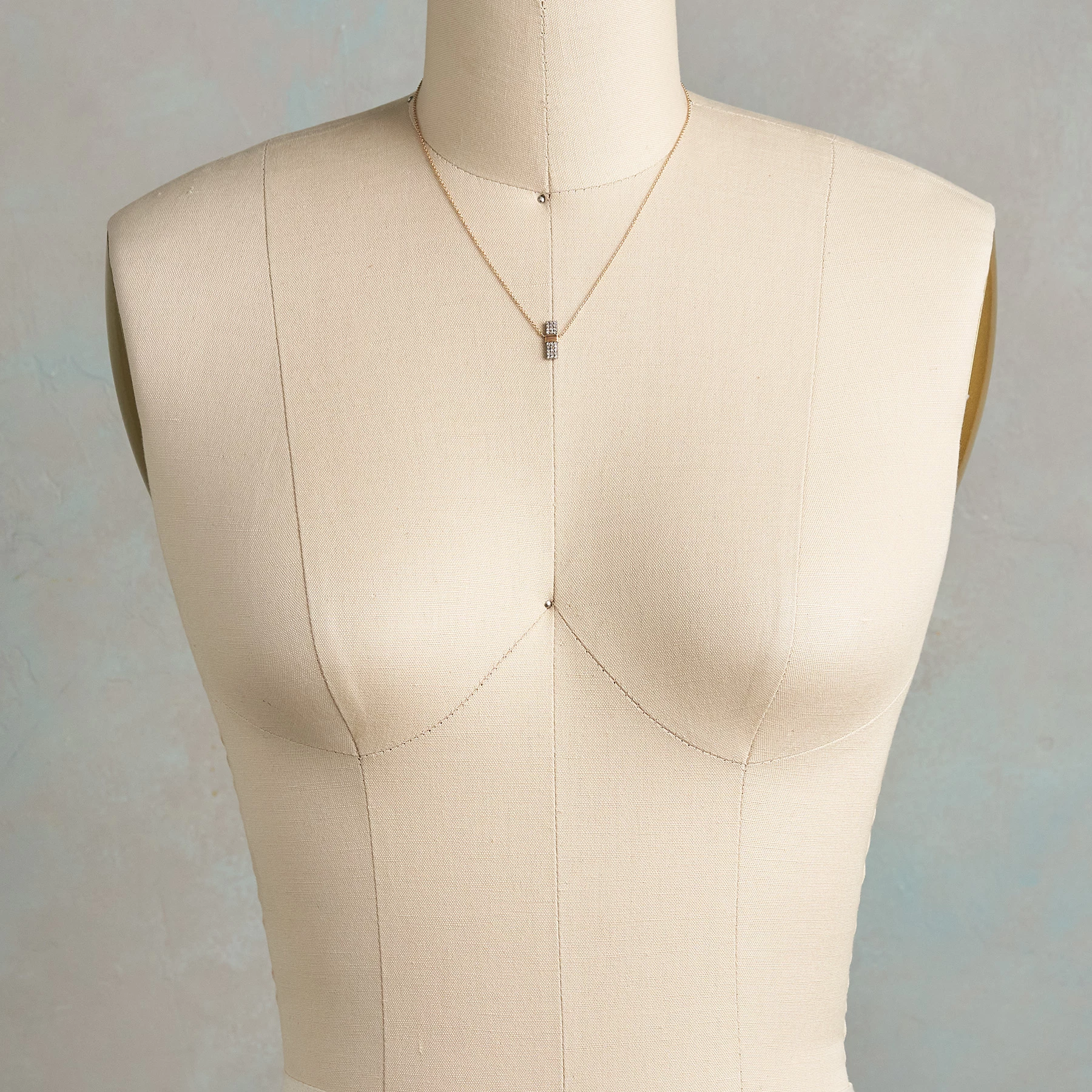 Wrapped gold wire bisects two glittering rectangles of pavรฉ diamonds set in sterling silver. 14kt gold chain; lobster clasp. Designed by Dana Kellin and handmade in USA. 16″l, 1/2″ drop.