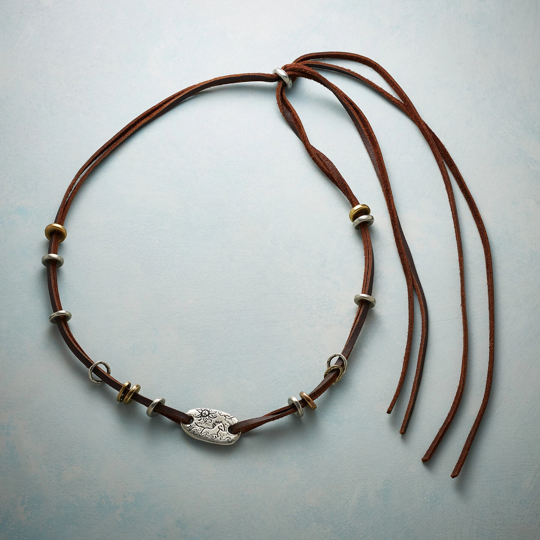 From Jes MaHarry—a hatband of supple leather strands strung with handcrafted brass-plated and pewter beads and centered with a pewter charm made using the lost-wax casting process and bearing a drawing by Jes. Made in USA. Exclusive. One size/Adjustable. Approx. 42″L. Hat sold separately.