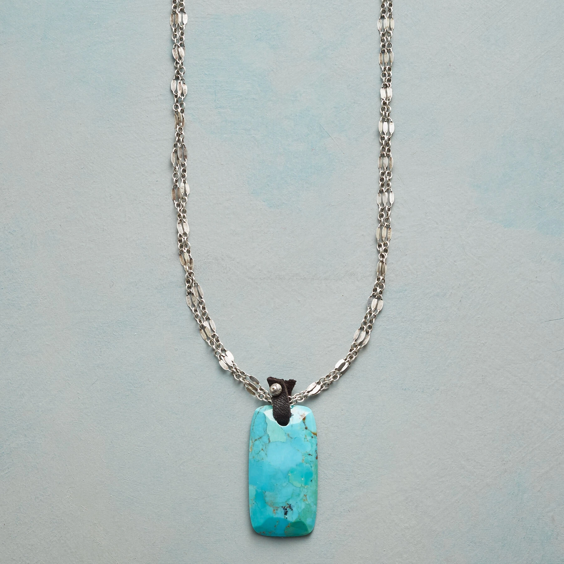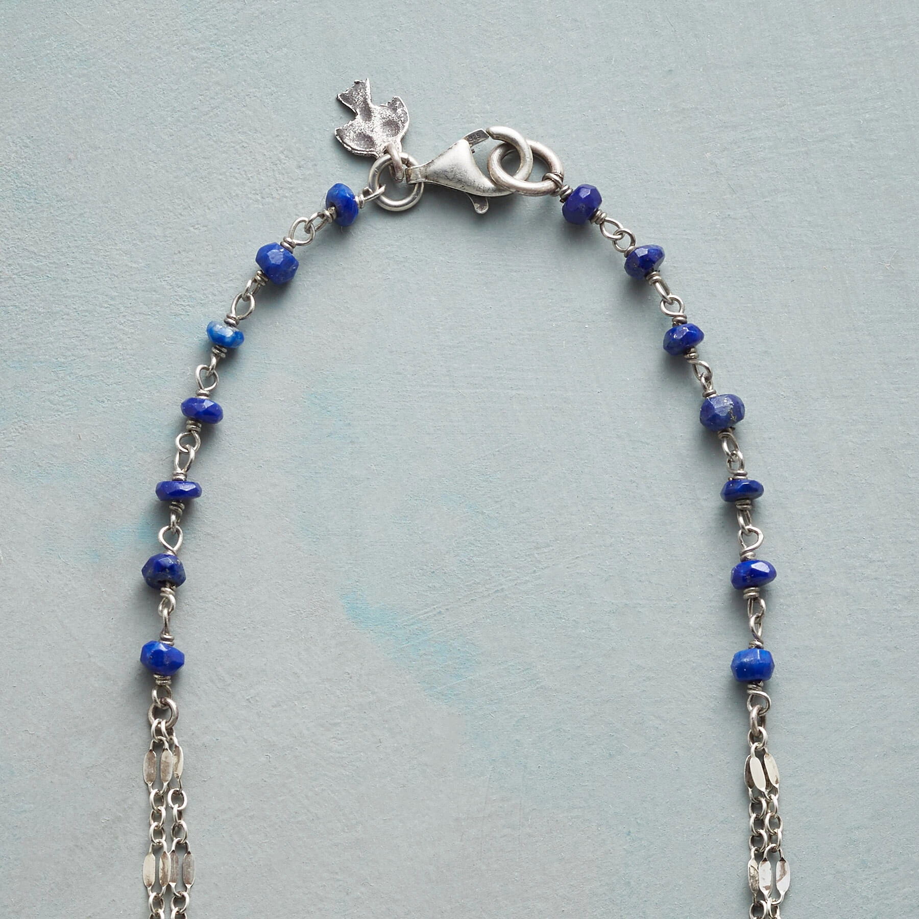 A lapis-beaded necklace leads to a delicate double sterling silver chain, flowing finally to a pool-like turquoise pendant affixed with chocolate-brown suede. Handcrafted. Sterling lobster clasp. Exclusive. 18″L.
