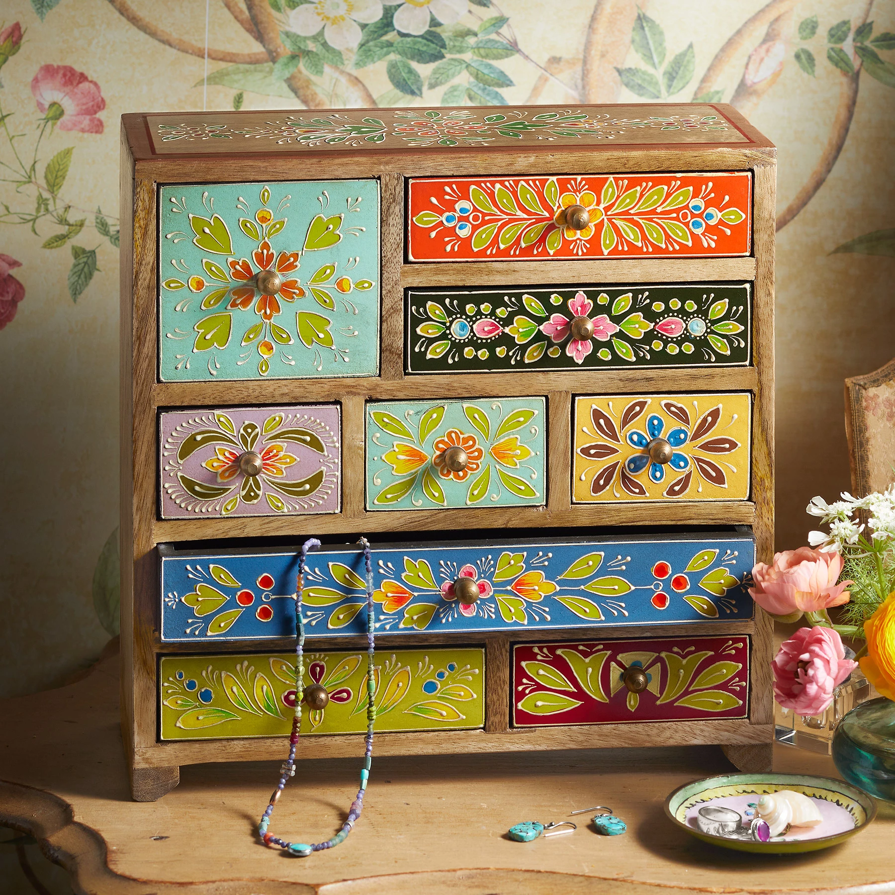 Hand-painted drawers bloom with colorful flowers against a backdrop of rustic wood, providing an artful home for jewelry and loved mementos. Exclusive. Imported. 12″W x 4-3/4″D x 11-3/4″H.