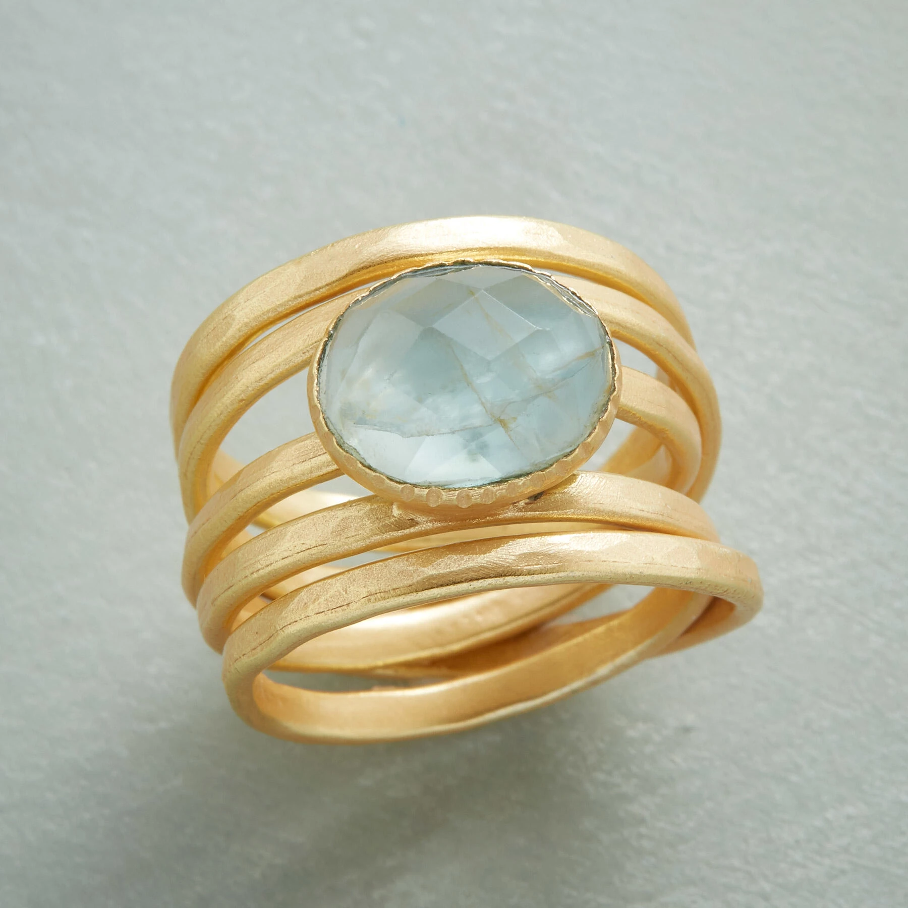 Glowing 22kt gold plate wraps ’round your finger five times, offering up a checkerboard-faceted dome of aquamarine. Exclusive. Whole sizes 5 to 10. Approx. 1/2″W.