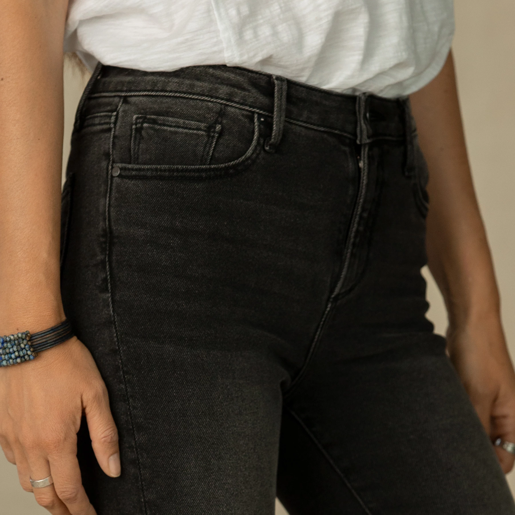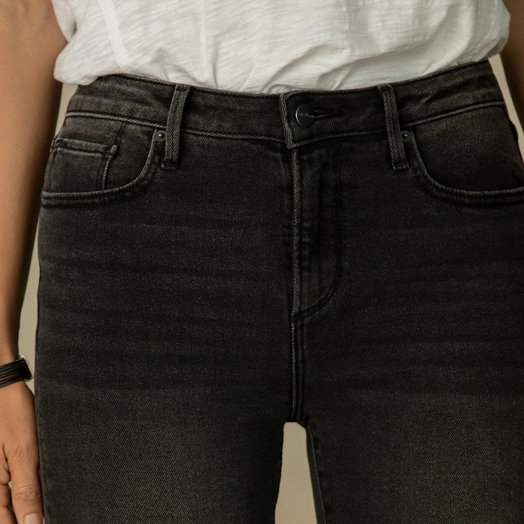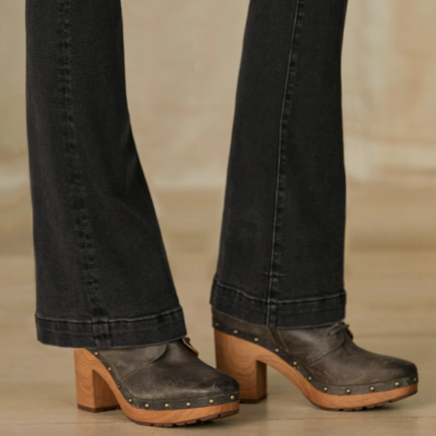 These dark wash jeans with just-right fading have a classic five-pocket styling with a zip fly and flare silhouette. Cotton/polyester/spandex. Machine wash. Imported. Exclusive. Sizes 24โ34. 32″ inseam; 10″ rise; 17″ leg opening.