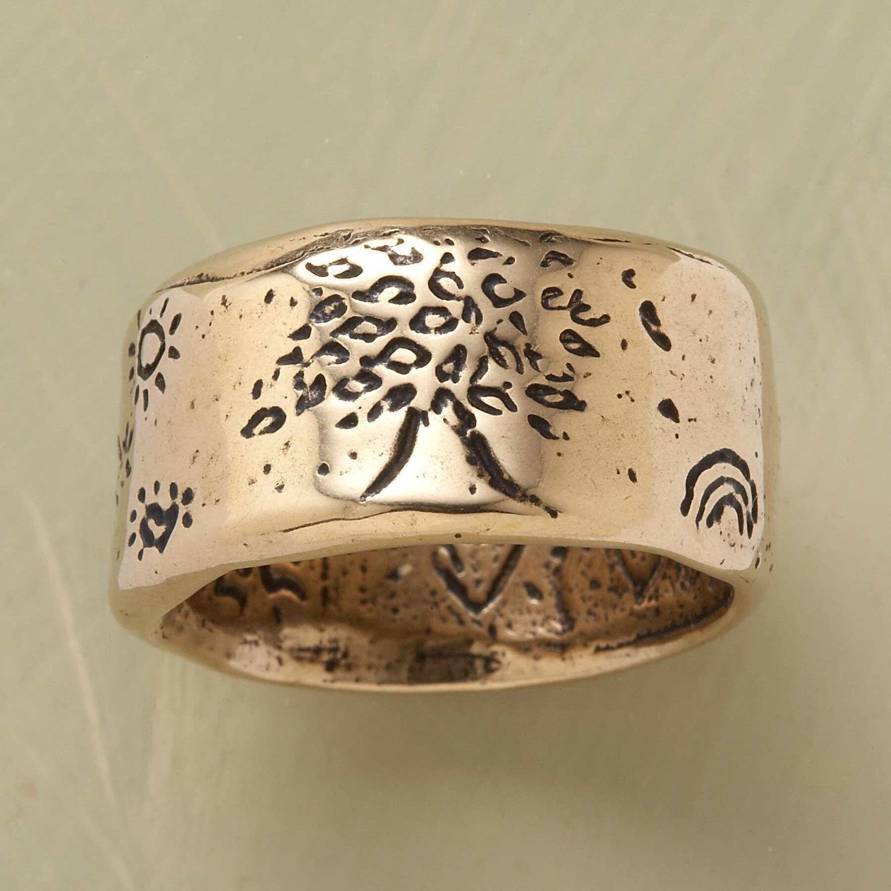 Our wonderfully hefty, 14kt yellow gold strength ring is inscribed “Grow Strong” and signed by the artist, Jes MaHarry. Made in USA. Exclusive. Whole and half sizes 5 to 11-1/2. 1/2″W.