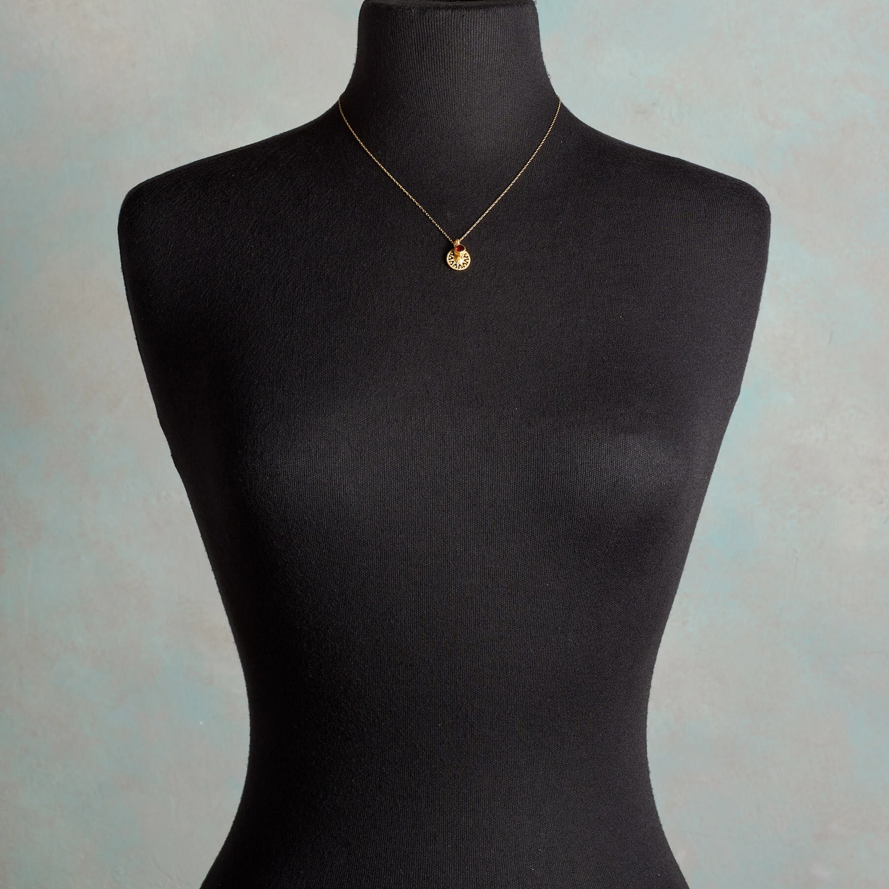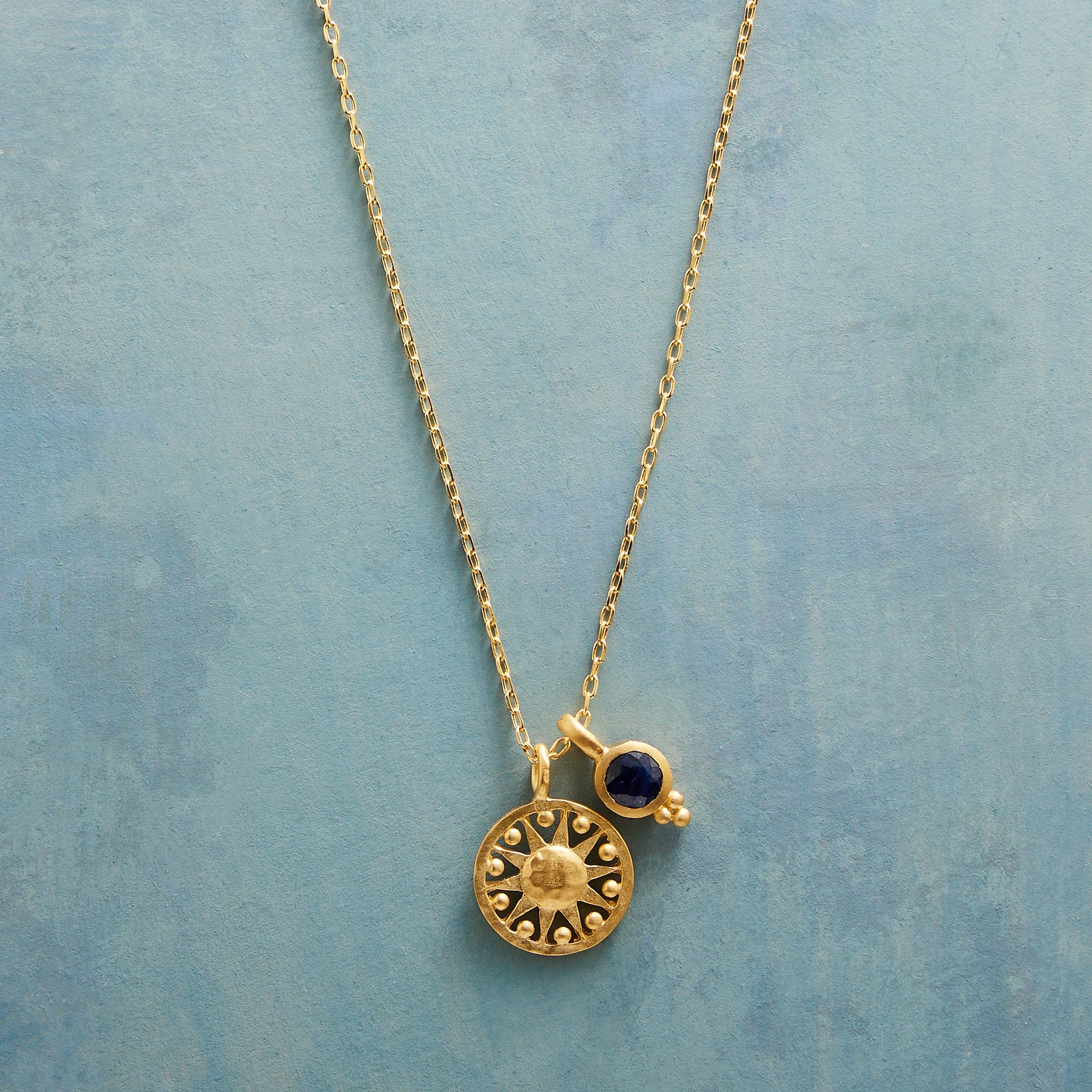 Show your individual beauty and charm with this handcrafted 18kt gold-plated necklace and let its radiant light shine on you. Specify birthstone when ordering. Lobster clasp. Exclusive. 18″L; 1/2″ dia. sun.